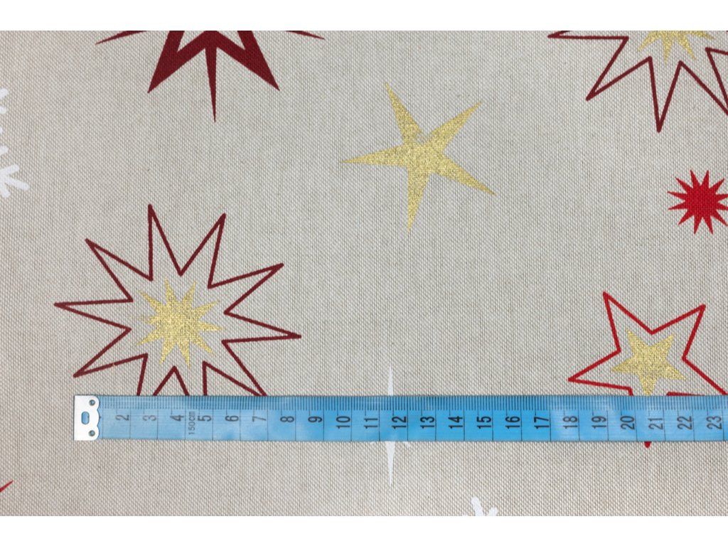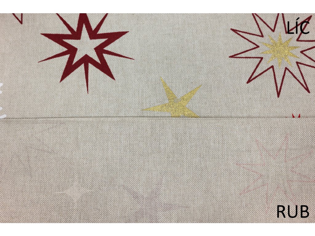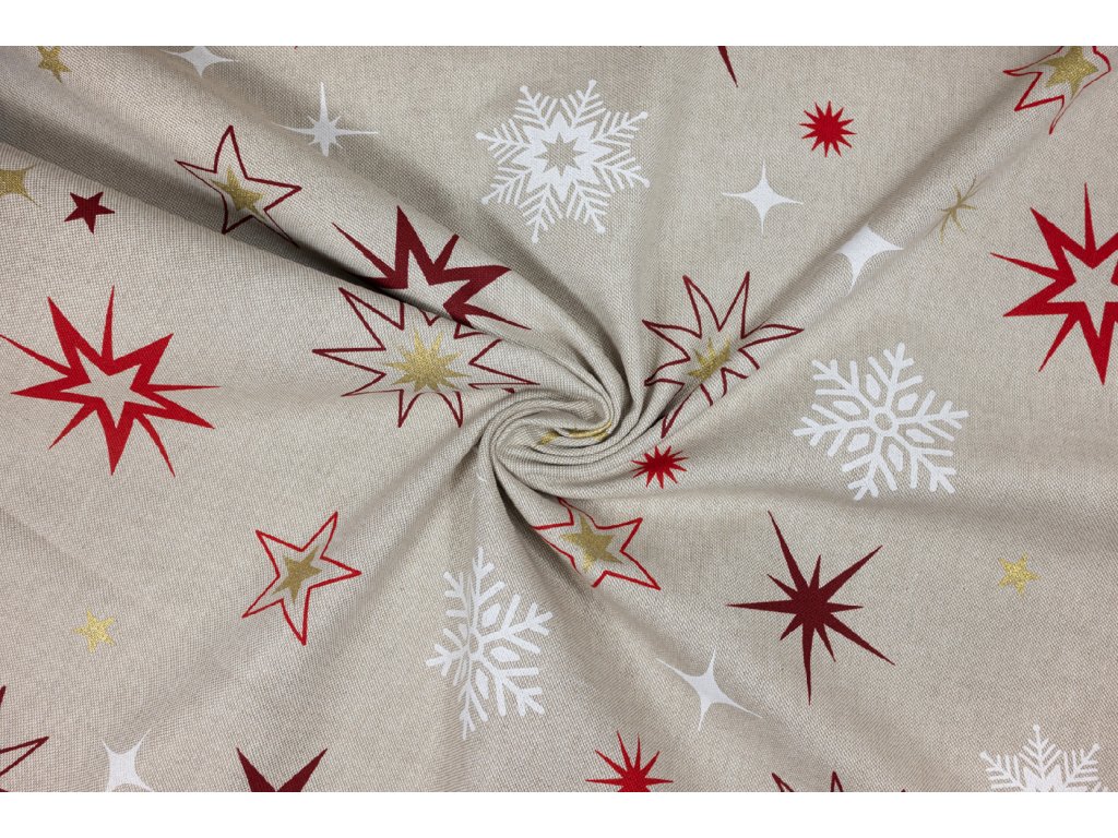 Bavlna režná červeno zlaté hvězdy s bílými vločkami