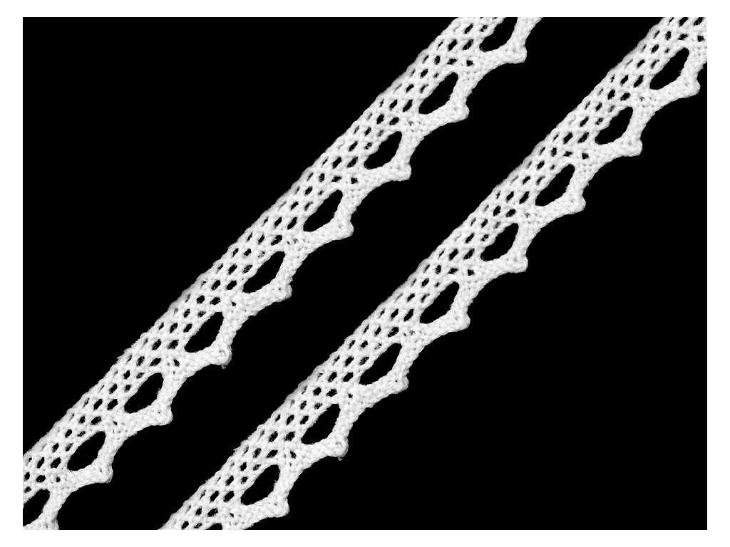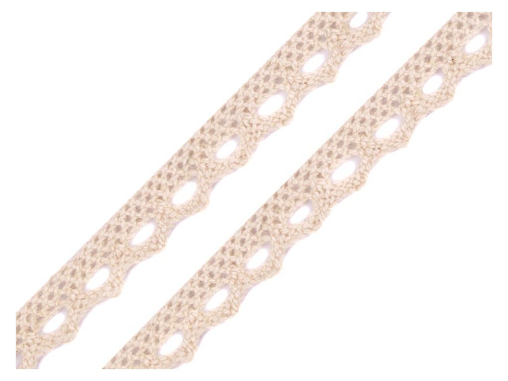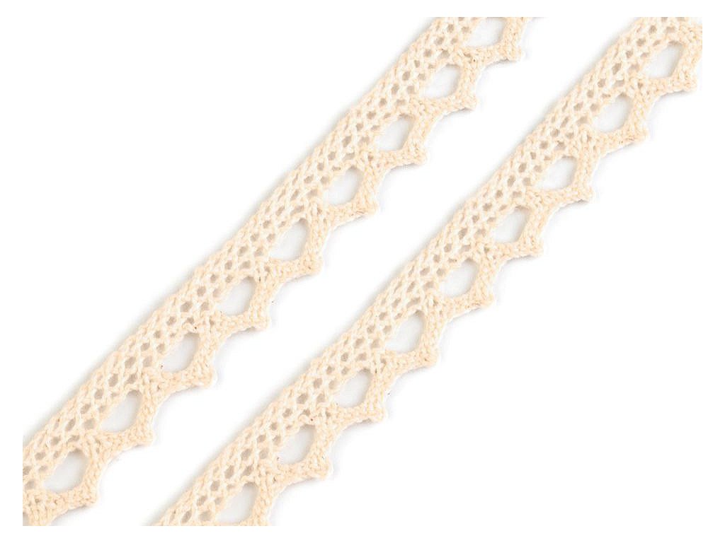 Pevná krajka je vyrobená z bavlny. Zdobí ji jemný paličkovaný vzor s drobnými očky.