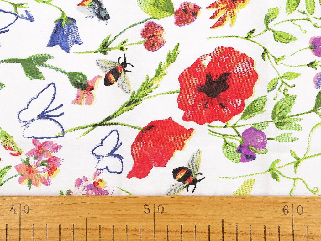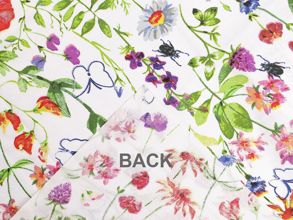 Bavlněná látka s lučními květy vnese do interiéru svěží a přírodní atmosféru. Využijete ji na šití povlečení, polštářů, závěsů, ubrusů, tašek, pytlíků a různých bytových dekorací a doplňků.