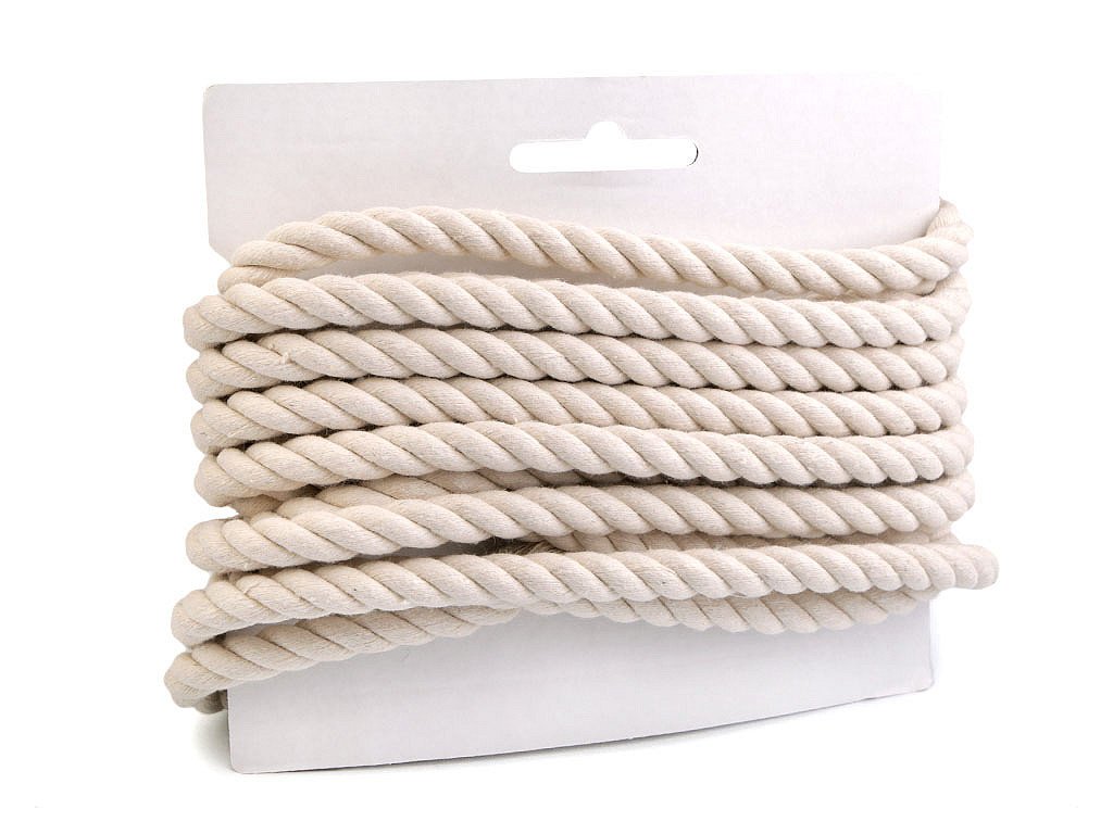 Bavlnená krútená šnúra je vyrobená z 3 pevnejších prameňov. Použitie: Krútená šnúra je vhodná na výrobu úch kabeliek a tašiek. Svoje využitie nájde aj ako dekoračný či funkčný materiál bytových doplnkov. Jedná sa o prírodný materiál. Balenie 18 m je voľne zmotané, balenie 20 m je na cievke.