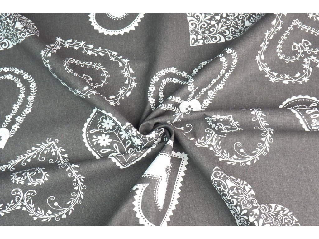 Bavlněné plátno bílá krajková srdce na šedé