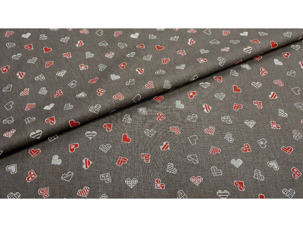 Bavlněné plátno bílá a červená srdíčka na šedé
