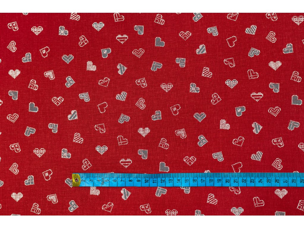 Bavlněné plátno bílé a šedé srdíčka na červené