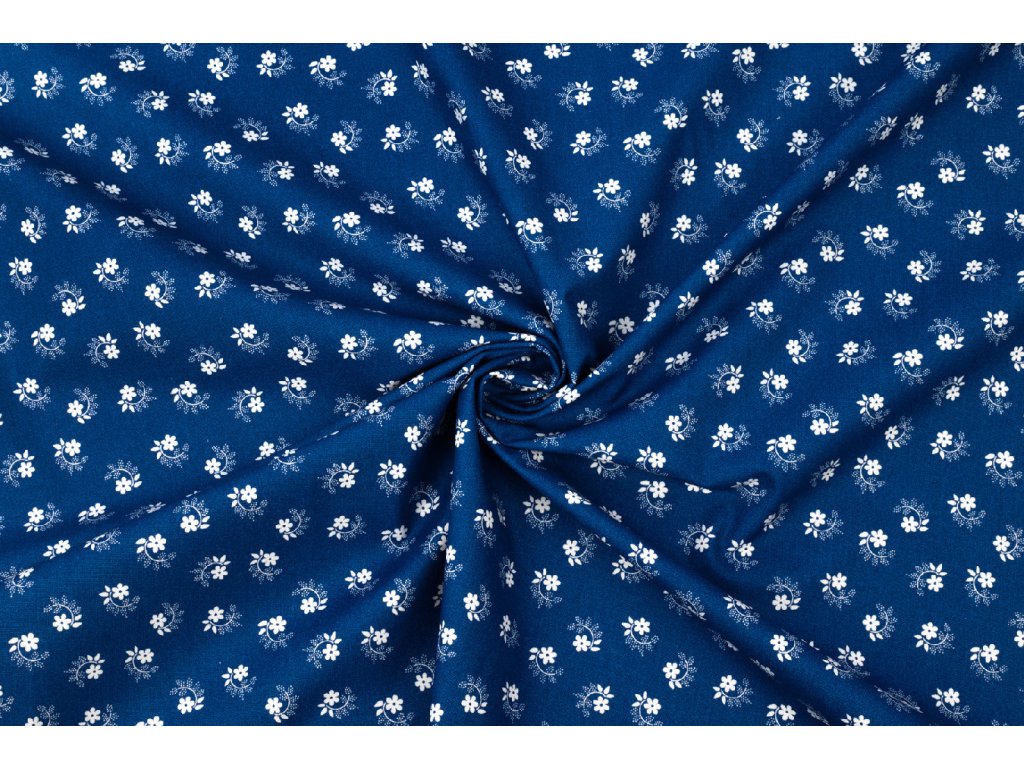 Bavlněné plátno bílé kvítky s lístky na modré
