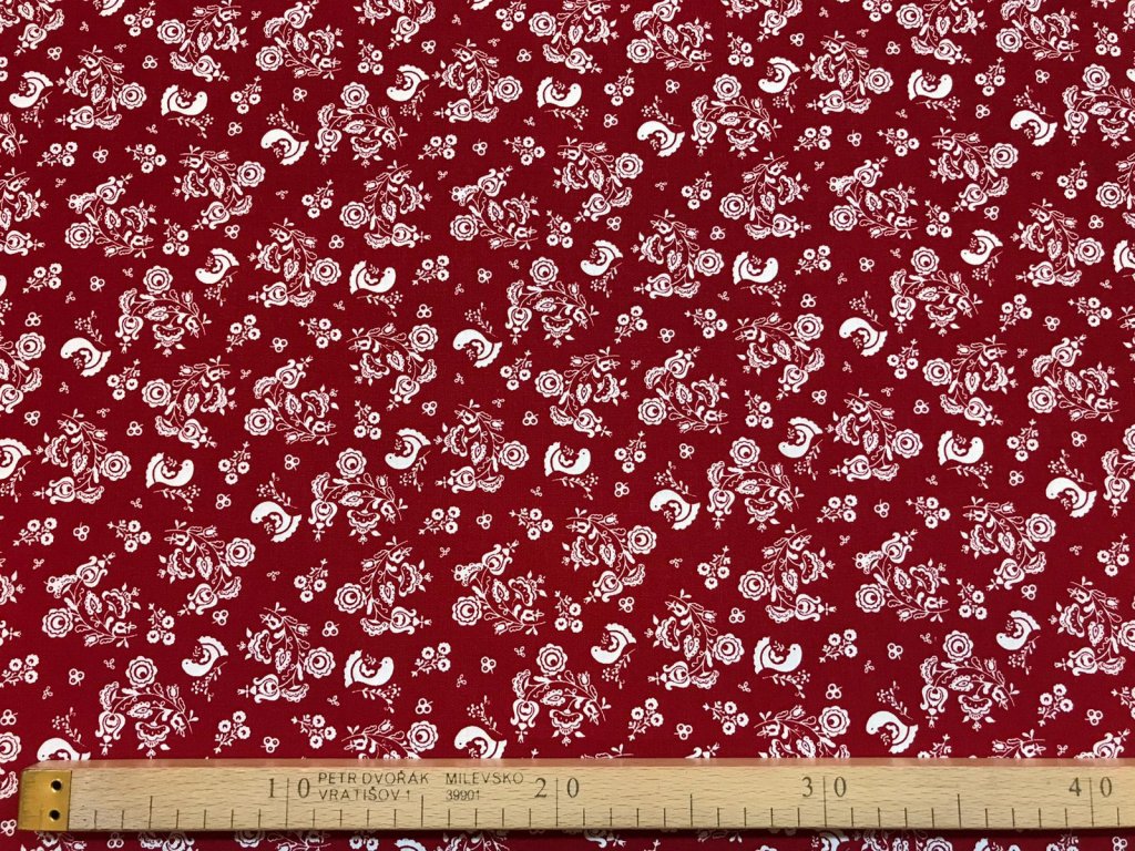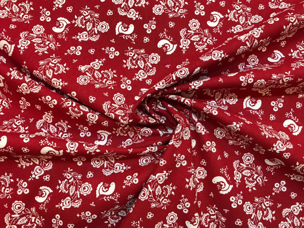 Bavlněné plátno folklorní motiv s ptáčky na červené