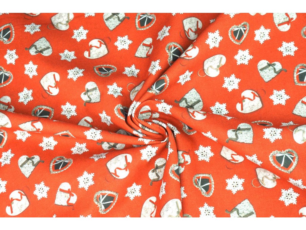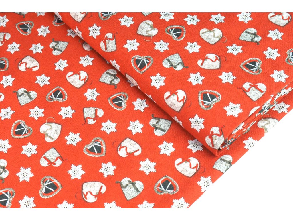 Bavlněné plátno vánoční šitá srdíčka