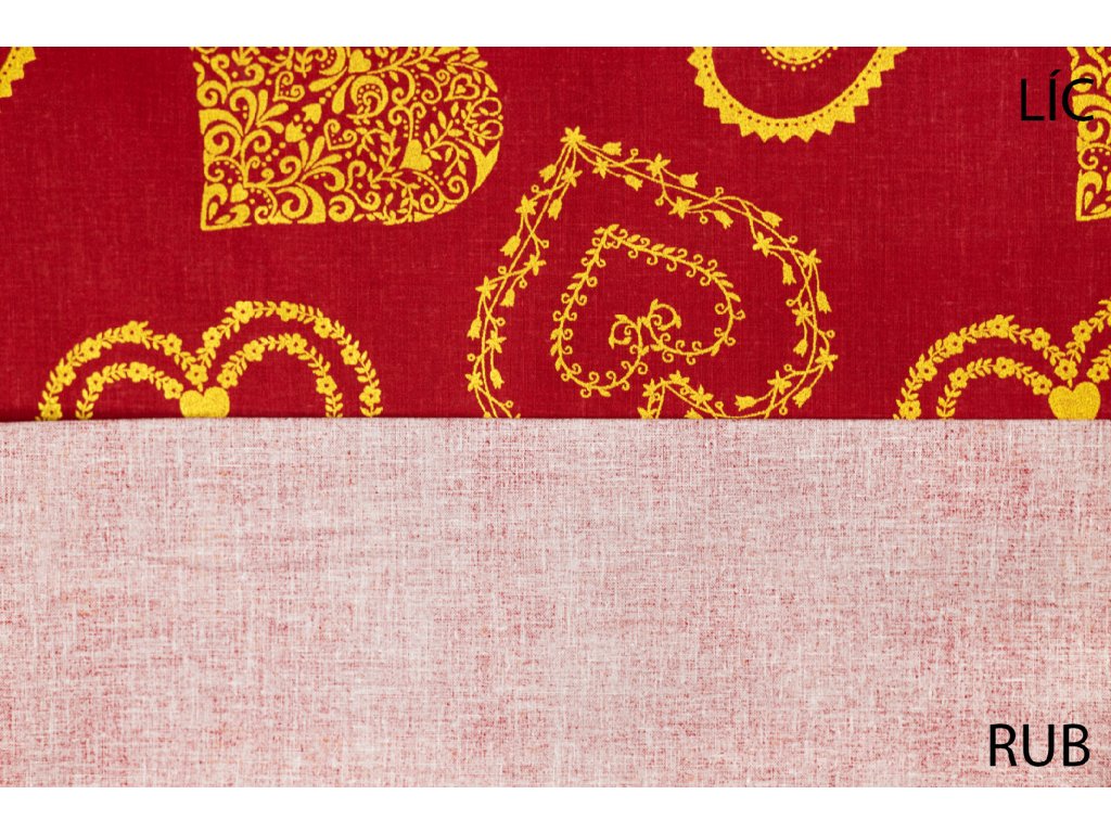 Bavlněné plátno zlatá krajková srdce na červené