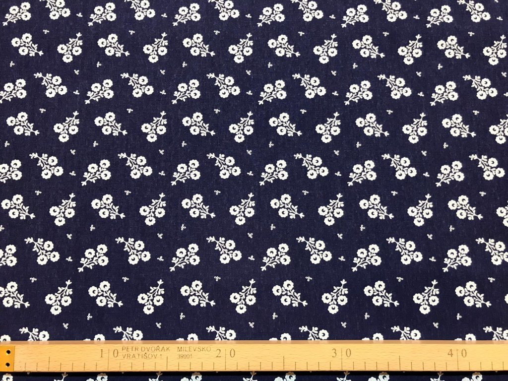 Bavlněné plátno svazek bílých folklorních květů na modré