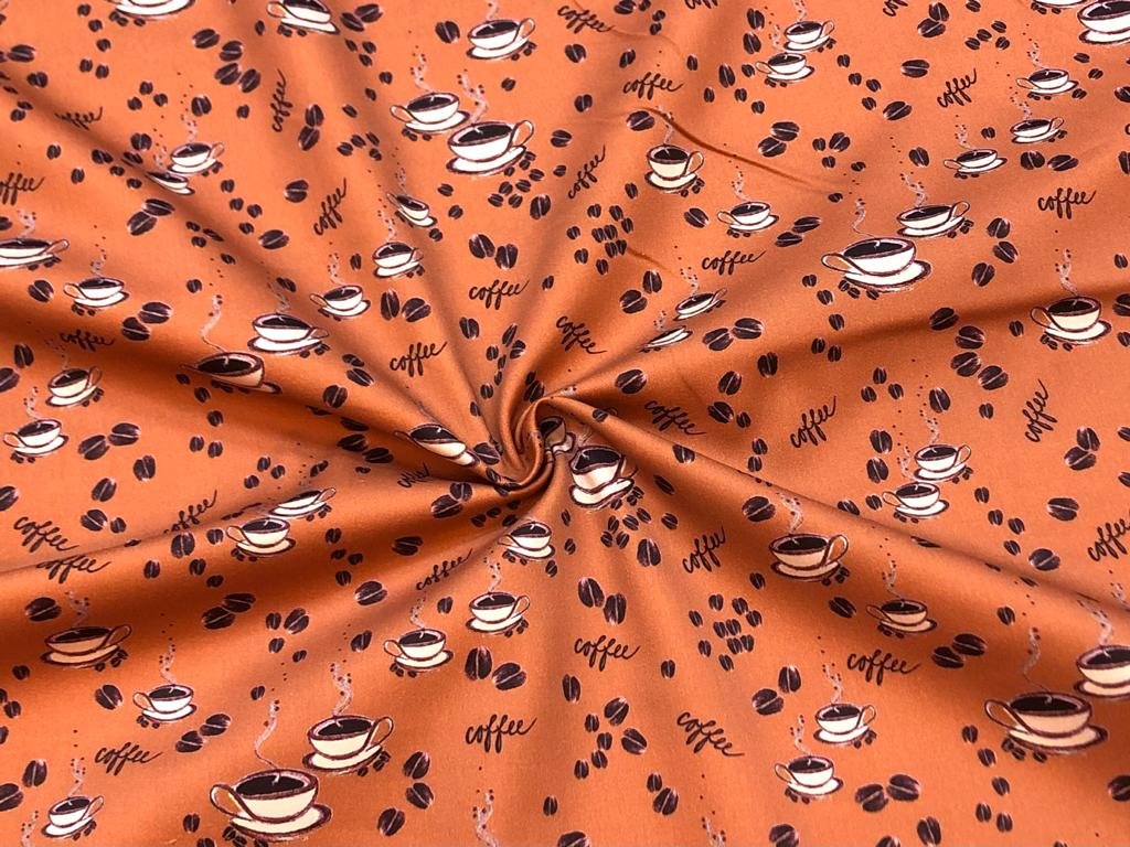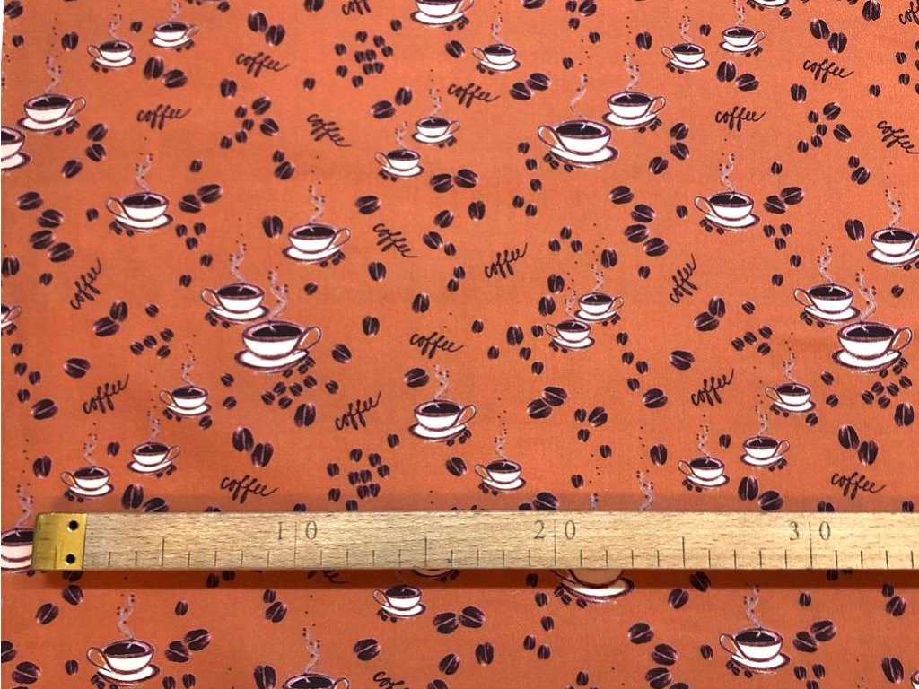 Bavlněný satén šálky a kávová zrna na rezavé - Vzor od Mamtex.cz