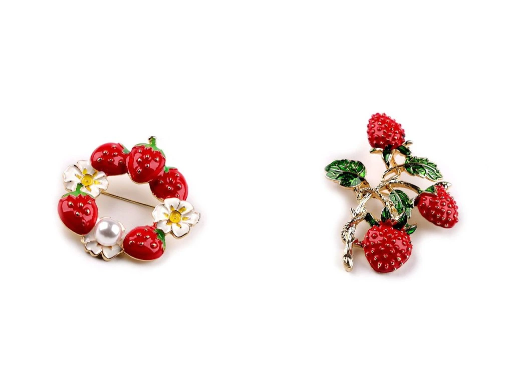 Kovová brož s jahodami si vás získá svým svěžím designem. Je ozdobená barevným smaltem, hravě zkrášlí oděvy i doplňky jako jsou kabelky, klobouky, šátky apod. Zapíná se pomocí brožového špendlíku.