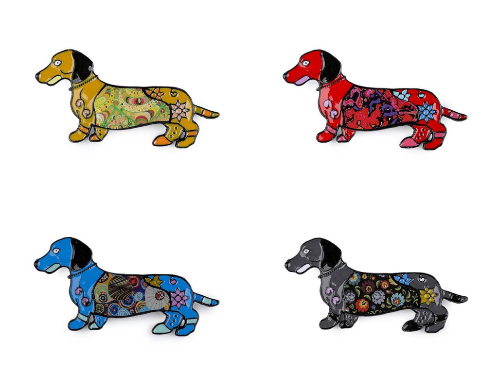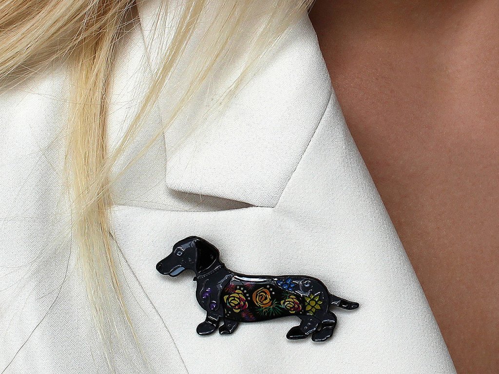 Brož pejska jezevčíka s barevným smaltem je doplňkem, který okamžitě upoutá pozornost. Svým designem spojuje hravost s elegancí, což z ní činí ideální volbu pro milovníky zvířat i módních trendů. Z rubu má brožový špendlík. Můžete ji nosit nejen na oděvech, hodí se i k ozdobení klobouků, tašky či sepnutí šátku. Je skvělým dárkem pro každého, kdo ocení originální a hravé módní doplňky.