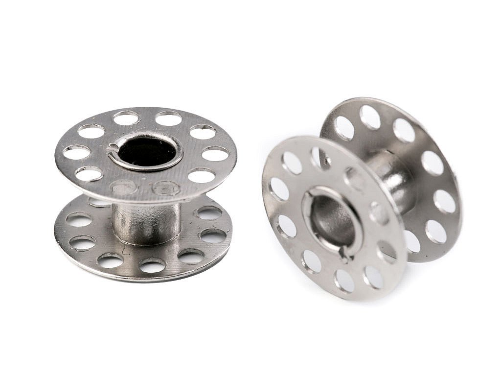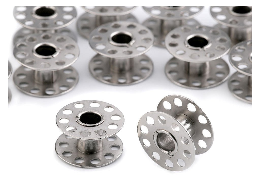 Kovová cívka na navinutí nití je určena k šicímu stroji Lada. Díky dírkám po stranách ji využijete také na výrobu originální bižuterie.