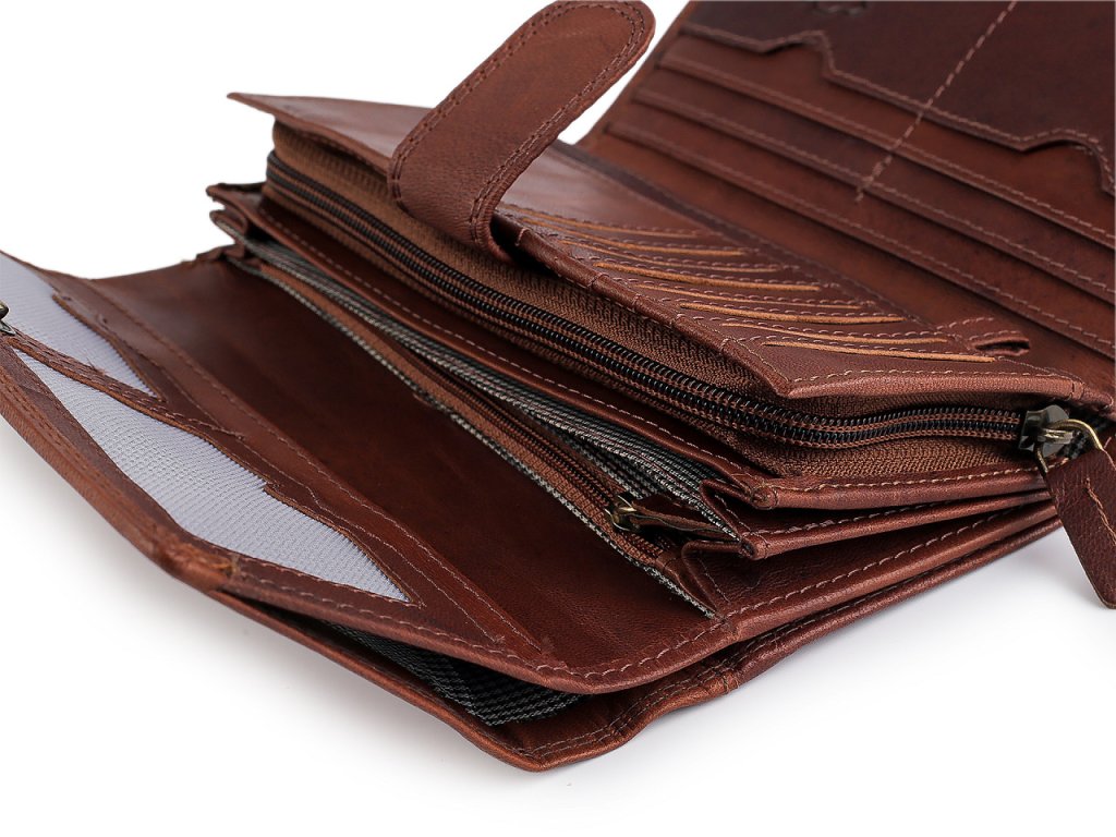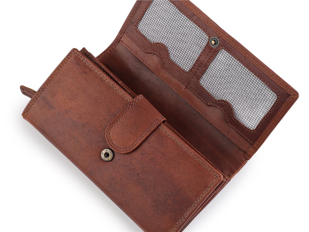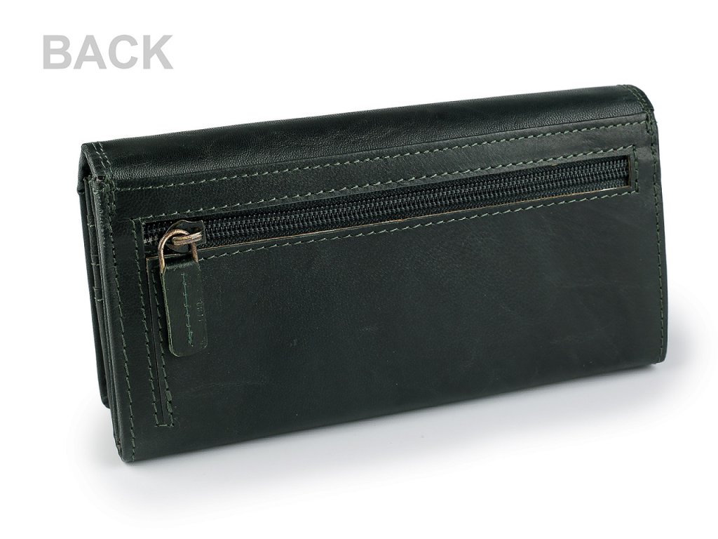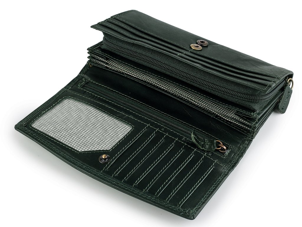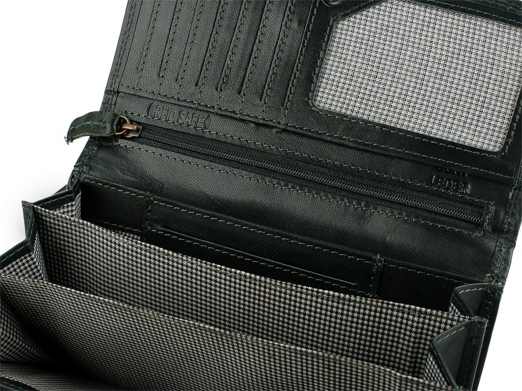 Peněženka má přední stranu na klopu se zapínáním na patent. Po otevření se objeví 14 přihrádek na kreditní karty, 1 je průhledná. Za přihrádkami po pravé straně jsou 2 dlouhé přihrádky, jedna se uzavírá na zip. Po rozevření naleznete 3 velké kapsy rozdělené separací, 1 plochou kapsu a 1 kapsu na zip, sloužící jako mincovník, která je separací rozdělená na 2 oddíly. Na zadní straně má peněženka velkou plochou kapsu a rozkládací kapsu na zip, která také může sloužit jako mincovník.