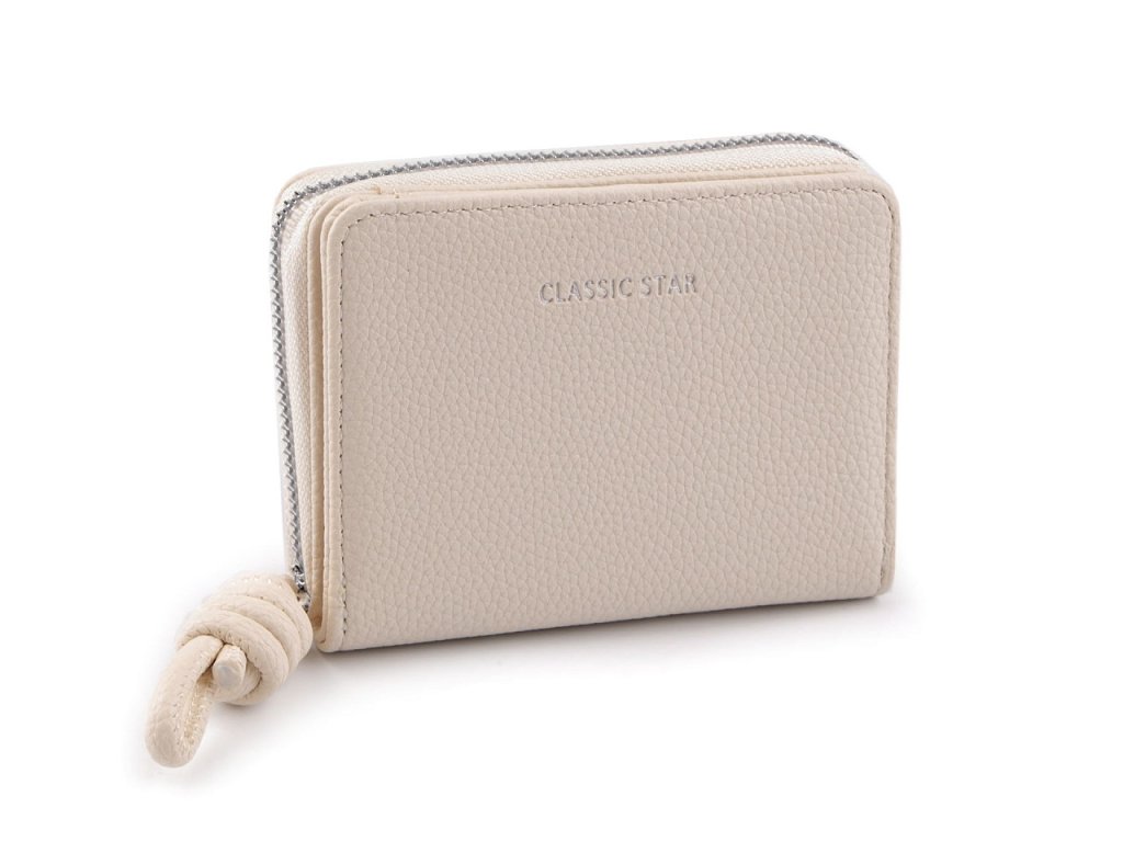 Dámská peněženka s ozdobným uzlem kombinuje stylovou eleganci a praktické využití. Na přední straně má stříbrný potisk Classic star. Peněženka má kompaktní tvar, je vyrobená z kvalitního materiálu s matným povrchem, který je příjemný na dotek. Její velikost je tak akorát do kabelky.