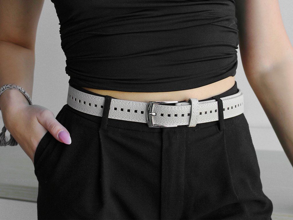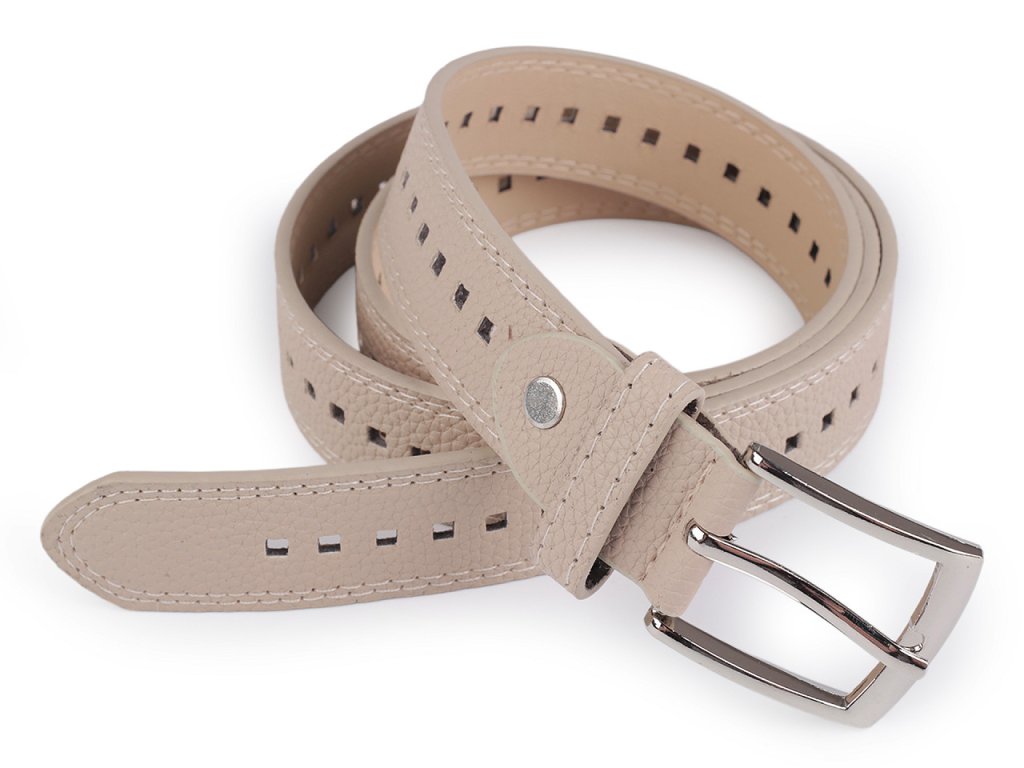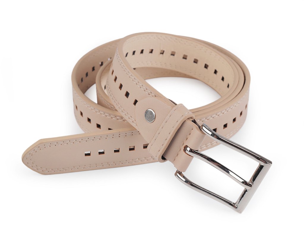 Dámský pásek s oky po celé délce se řadí k nadčasovým modelům. Je vyrobený z eko kůže, některé pásky jsou čistě hladké, některé mají na povrchu efektní vzor kůže. Mohou jej nosit i dívky, protože obvod pásku si lehce přizpůsobí svému pasu. Díky jednoduchému designu se dá dobře kombinovat se širokou škálou oděvů. Má klasickou kovovou sponu na zapnutí a štepování po obvodu.