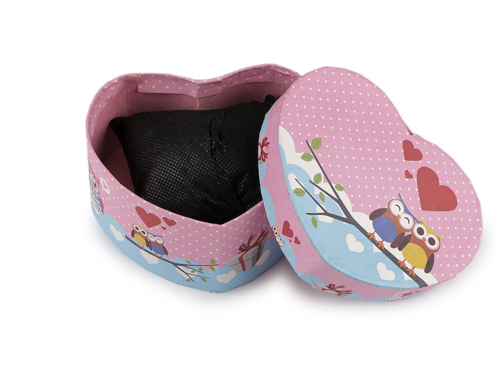 Papírová krabička ve tvaru srdce je ozdobená potiskem roztomilých soviček. Je určená na malé dárky, uvnitř má odnímatelný polštářek vhodný na darování hodinek nebo náramku. Krabička je velice pevná.
