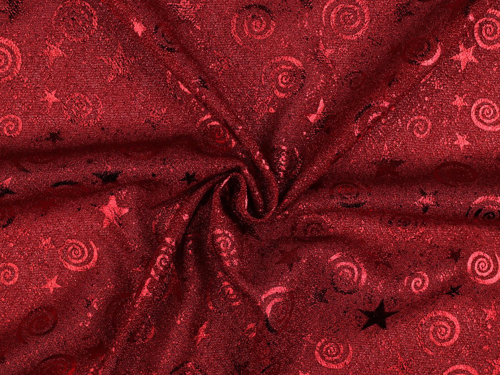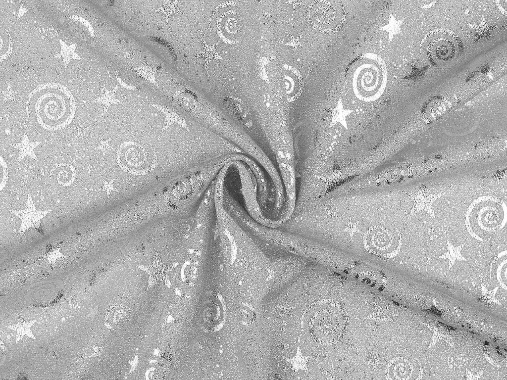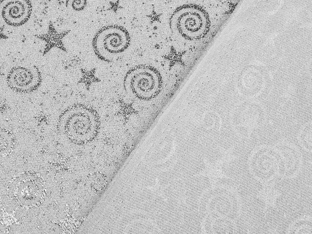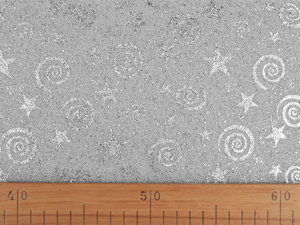 Dekorační třpytivá látka je jemně průsvitná, krásně splývavá. Do délky je pevná, do šíře je velmi pružná. Na horní straně má vzor hvězdy a spirály. Využijete ji na šití pytlíků, běhounů na sváteční stůl a k různým vánočním dekoracím. Hodí se i na výrobu andělských kostýmů. Je vhodná i k balení dárků.