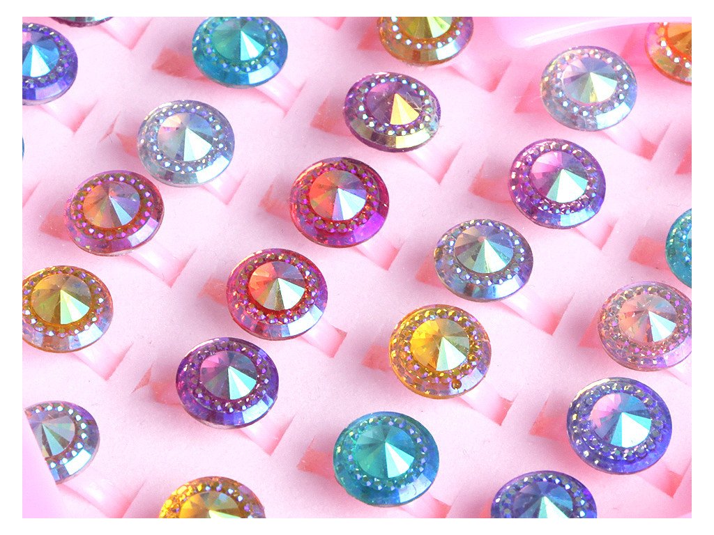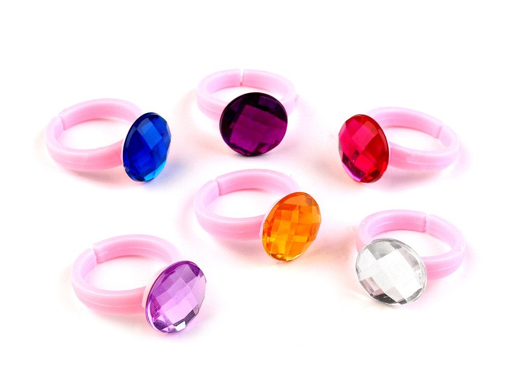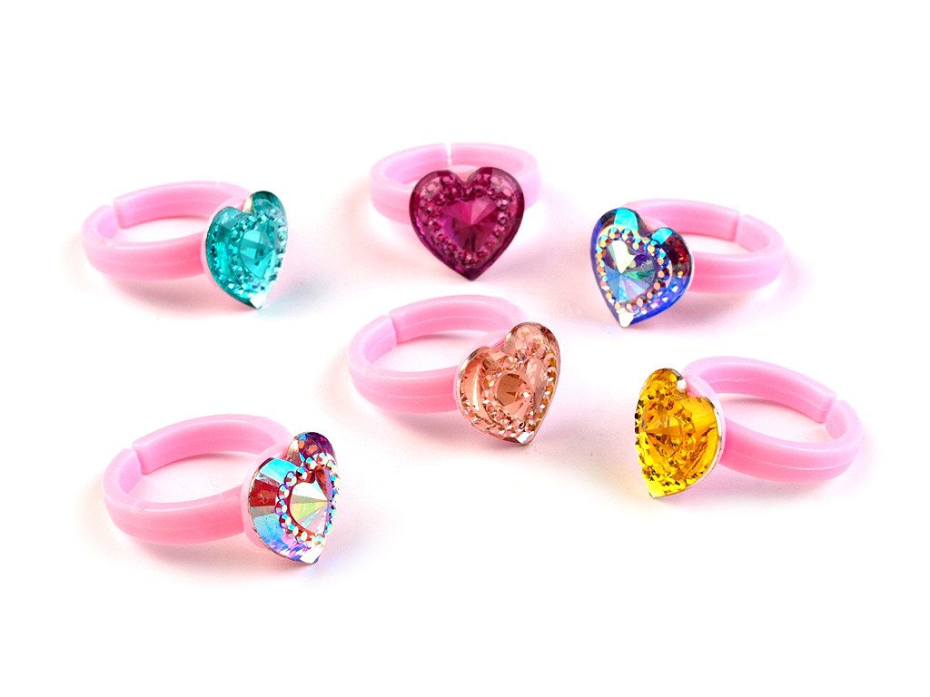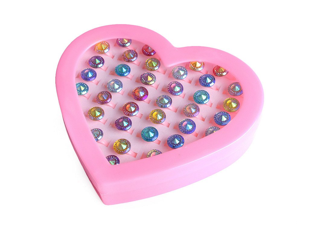 Mix dětských prstýnků je zabalený v plastové srdcové kazetě, která má průhledné plastové víko. Je ideální na prodejní prezentaci. Prsteny jsou ozdobené plastovým kamenem, který v dětských očích vypadá jako zářivý drahokam.