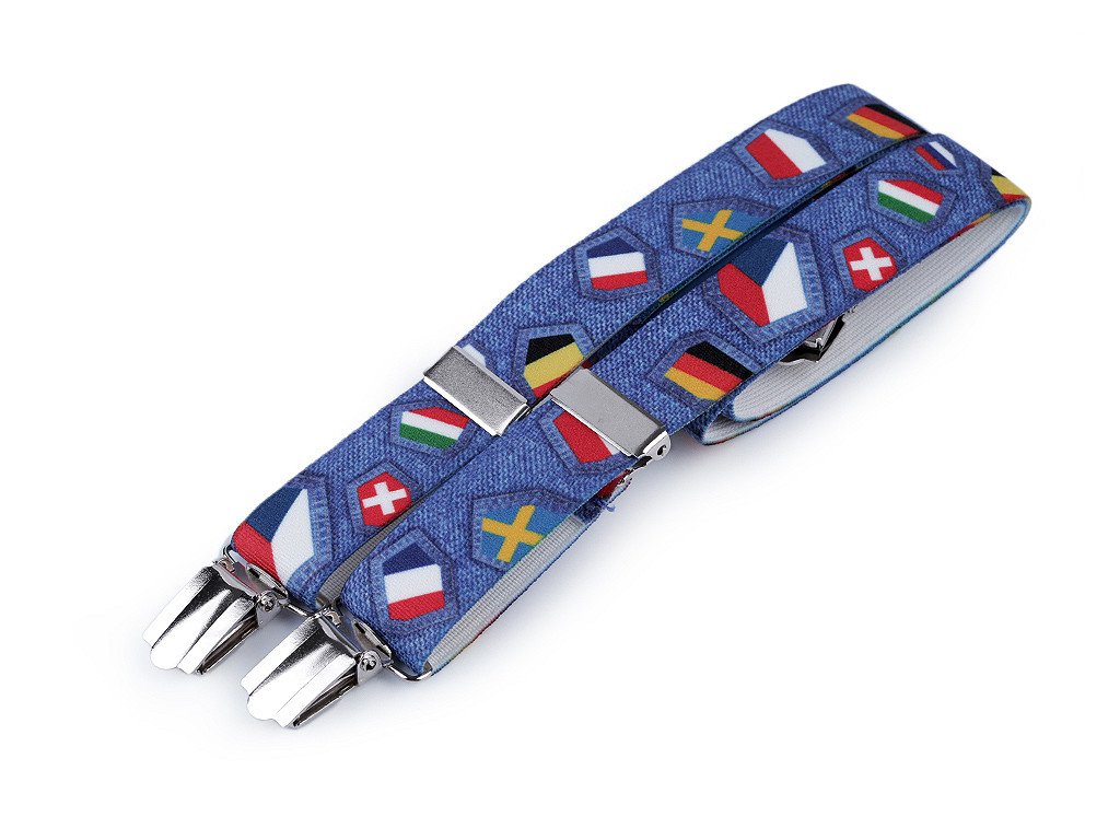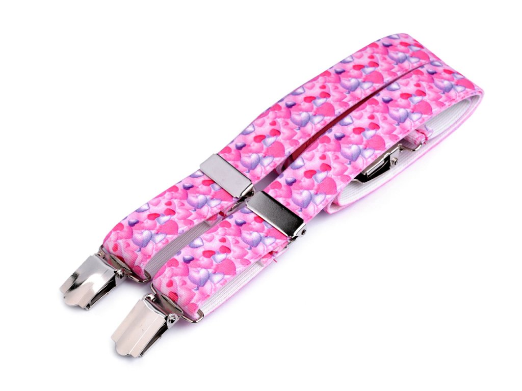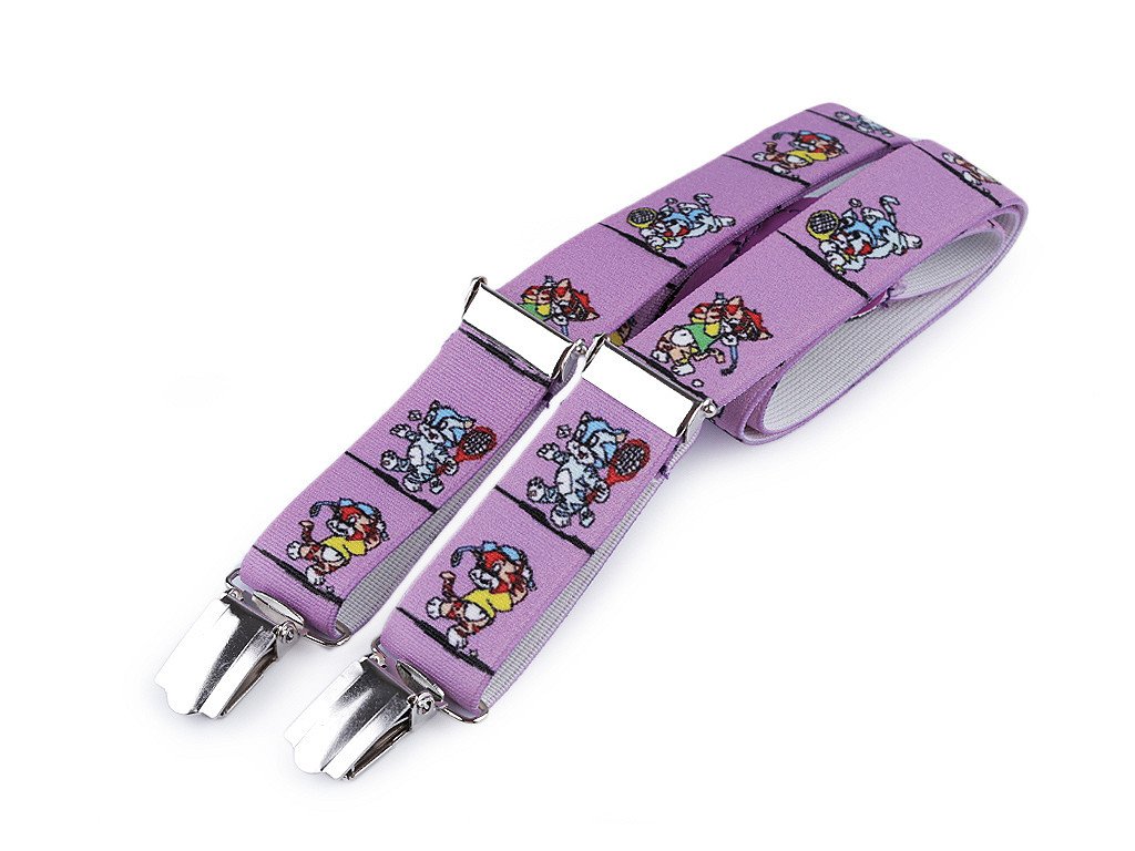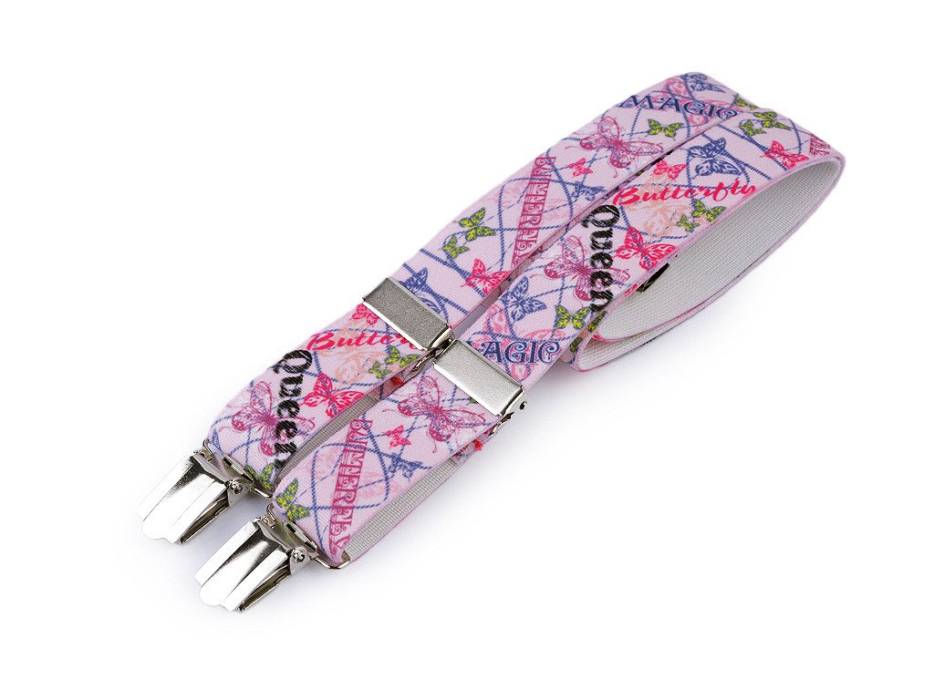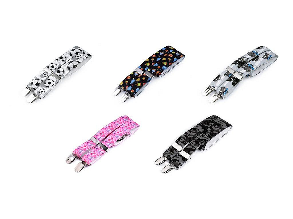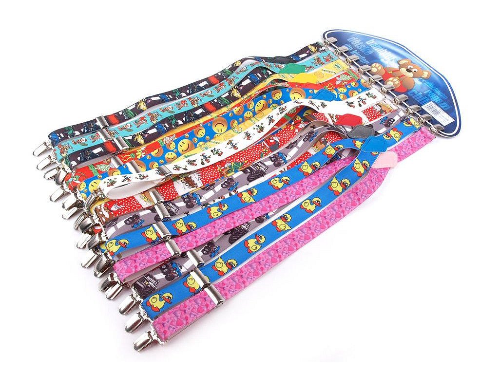 Dětské šle o délce 70 cm a šířce 2,5 cm s různými potisky, které se neodírají ani neloupou. Originální balení obsahuje 10 ks šlí v různých barvách a motivech. Jedná se o kvalitní český výrobek. Přichycují se pomocí kovových žabek, jsou vyrobené ze 100% polyesteru.