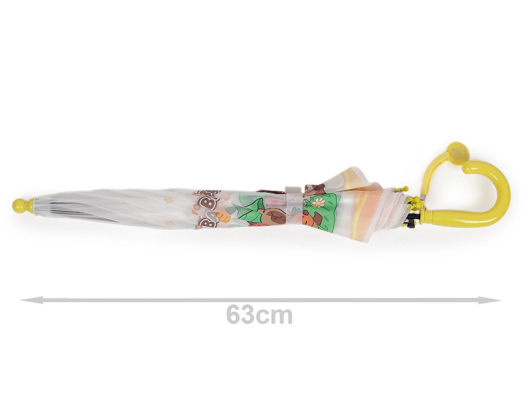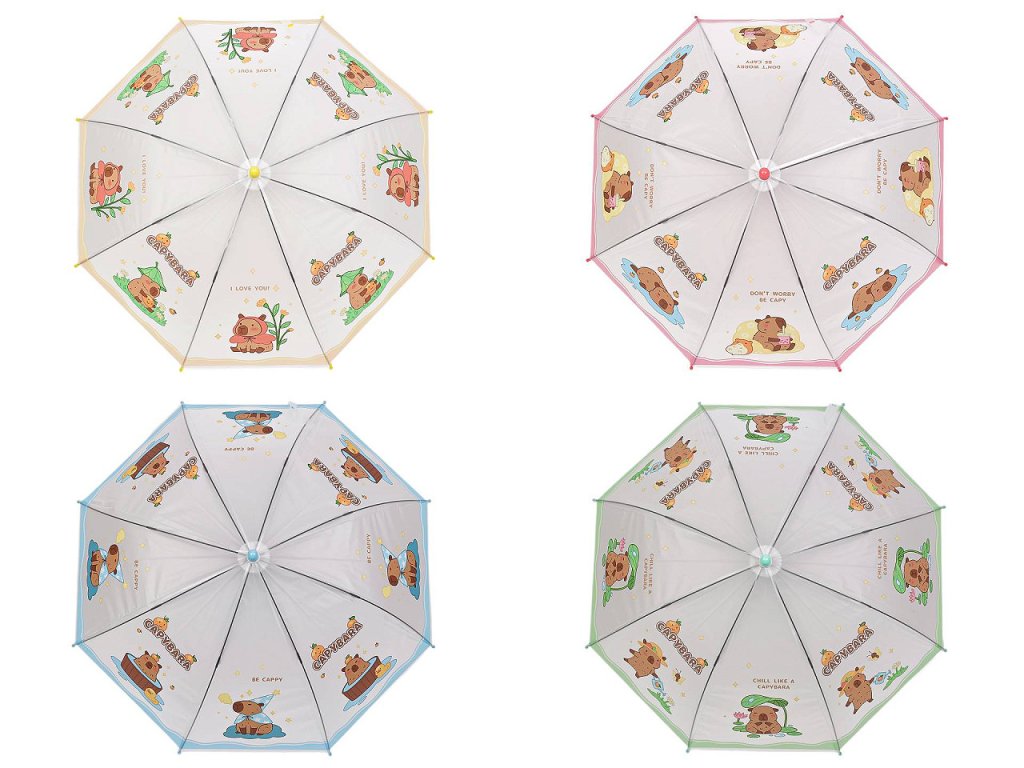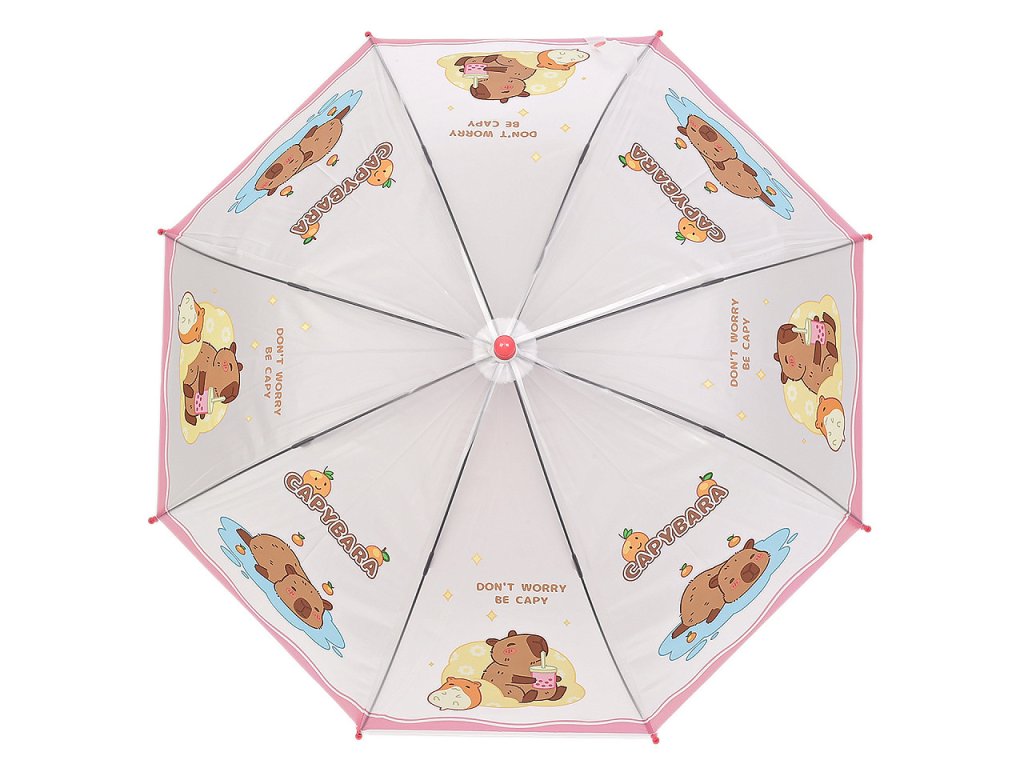 Dětský vystřelovací deštník s motivem kapybary je ideálním společníkem pro deštivé dny. Tento deštník je navržený s ohledem na potřeby dětí, kombinuje stylový vzhled s praktičností. Potah je průsvitný, na rukojeti má deštník visačku, na kterou můžete napsat jméno dítěte. Má klasickou tyč zakončenou pevnou rukojetí. Konstrukce deštníku je z pružných lamel a tvoří osm polí.