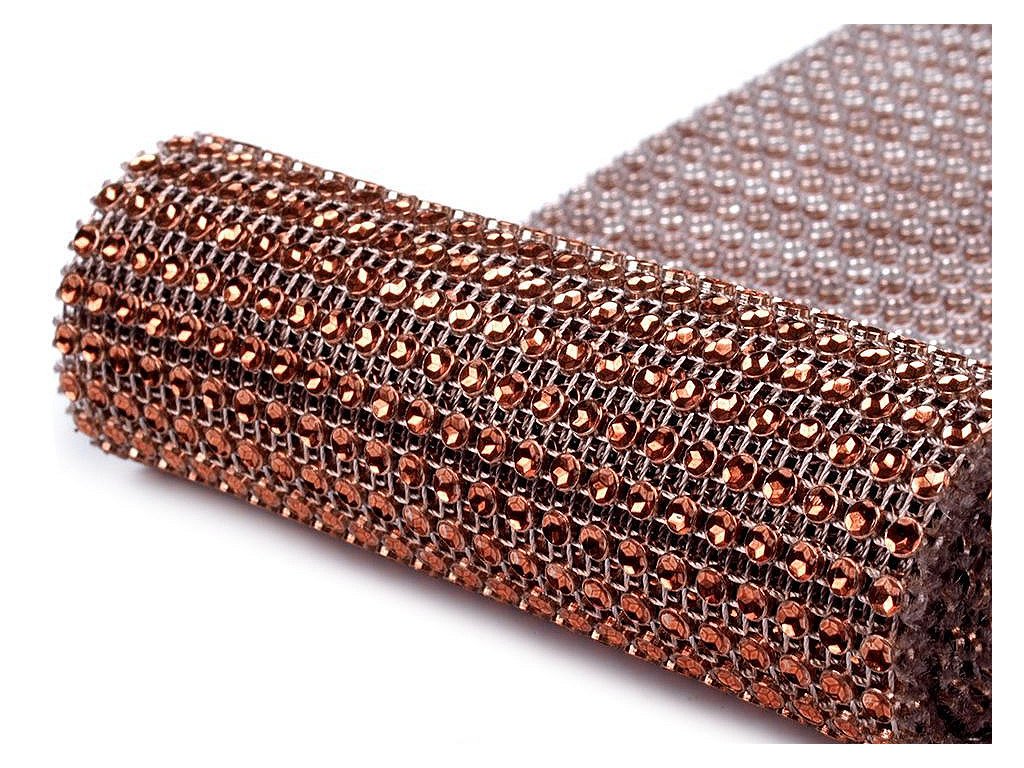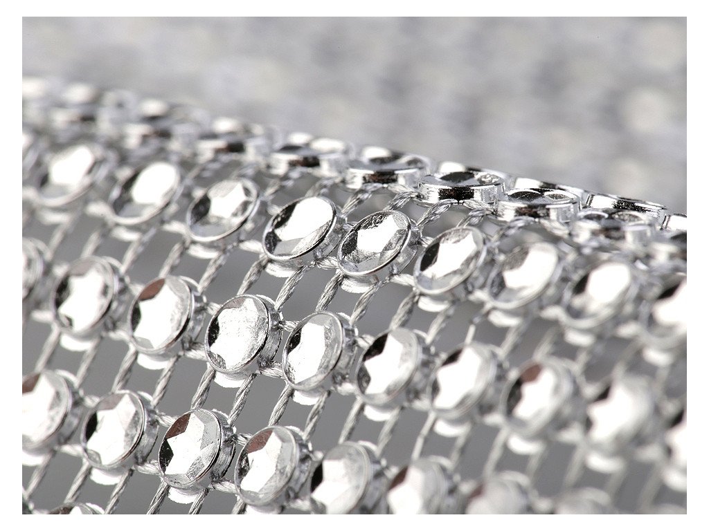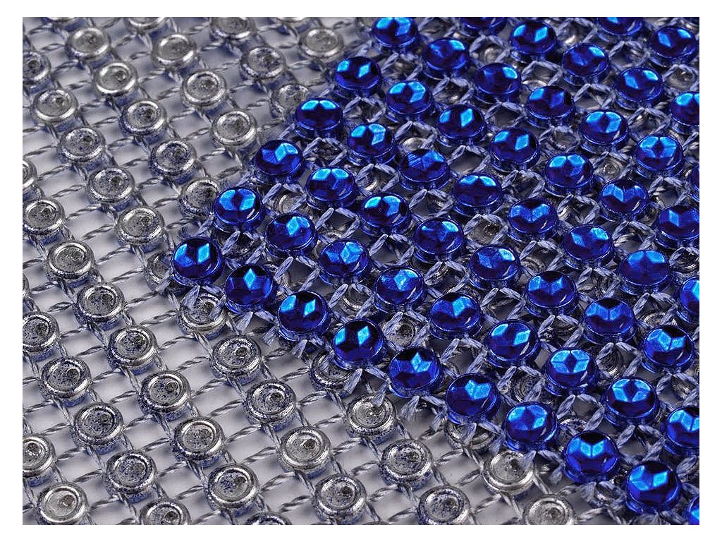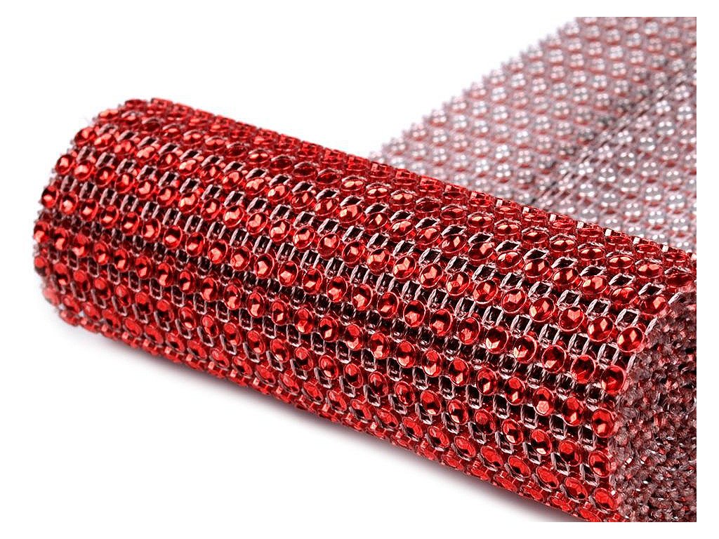 Zajímavá borta s barevnými plastovými očky o Ø 4 mm. Očka mají uvnitř vyobrazenou hvězdu, která díky lesku barvy věrohodně připomínají kamínky. Jednotlivé komponenty jsou spojeny pevnou nití. Rubová strana prýmku má vždy stříbrnou barvu. Třpytivý prýmek našijte na šaty a vytvořte originální model.