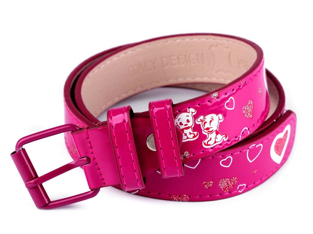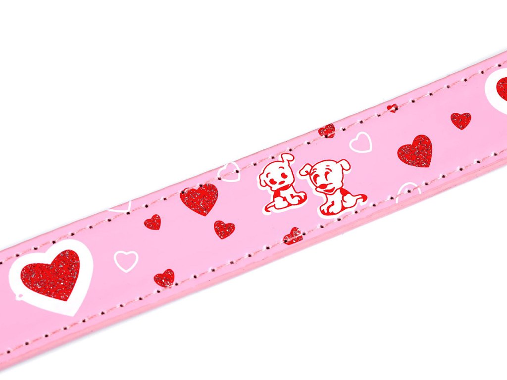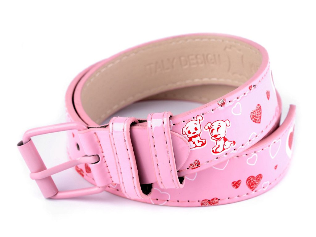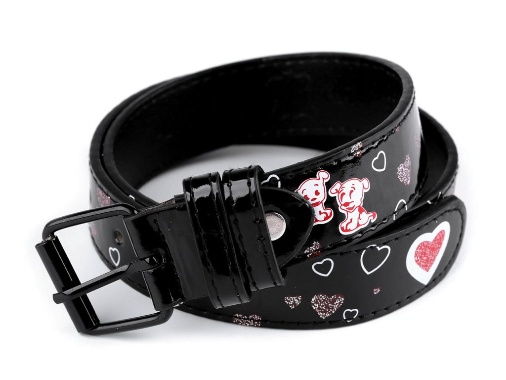 Dívčí pásek v klasickém provedení s kovovou sponou se hodí k jakémukoliv oblečení. Má hladký povrch s leskem, dívky si jej zamilují díky potisku pejsků a srdcí ozdobených jemnými glitry.