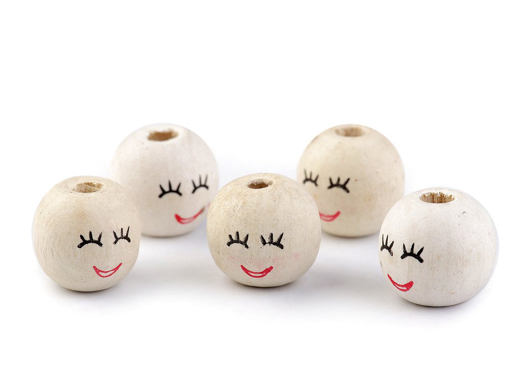 Dřevěné korálky s malovaným obličejem. S jejich pomocí si můžete uháčkovat panáčka, vytvořit veselý náhrdelník, vyrobit prstové maňásky, veselé zápichy do květináče apod.