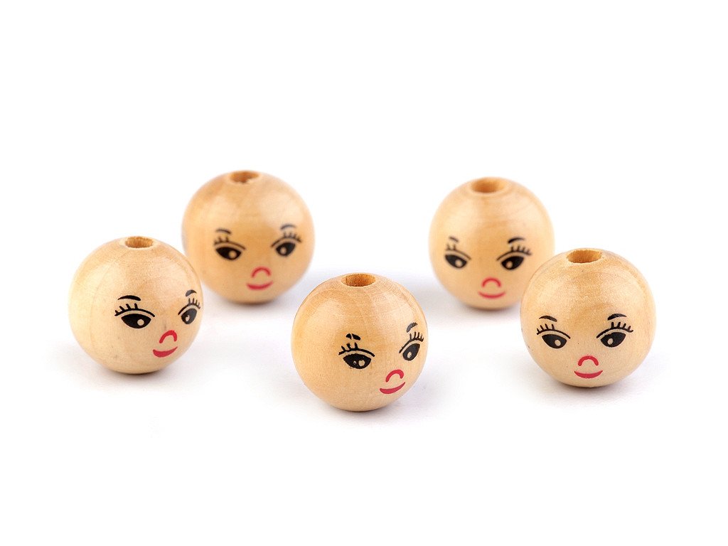 Dřevěné korálky s malovaným obličejem mají jemný lesk díky nalakování. S jejich pomocí si můžete vytvořit postavy andělíčků, uháčkovat panáčka, vytvořit veselý náhrdelník, vyrobit prstové maňásky, veselé zápichy do květináče apod.