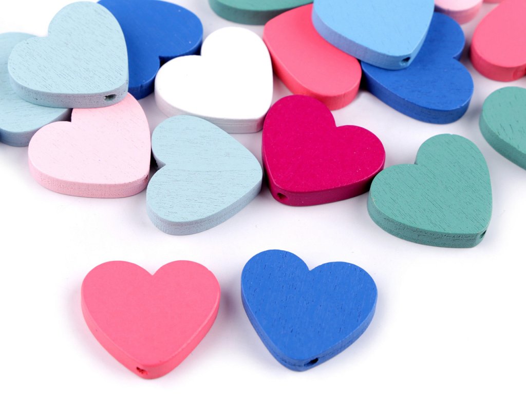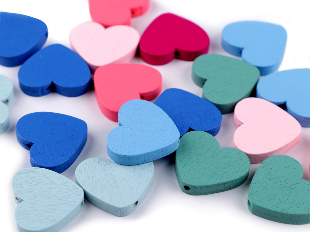 Mix barevných dřevěných korálků srdcí potěší nejen korálkářky, ale i děti. Jejich velikou výhodou je lehký materiál. Dají se skvěle kombinovat s dalšími dřevěnými korálky, s kulatými ale i s dalšími zajímavými tvary. Jsou oblíbené i na výrobu lapačů snů, dají se nalepit i na přání apod. Můžete je navlékat například na pruženku či silon.