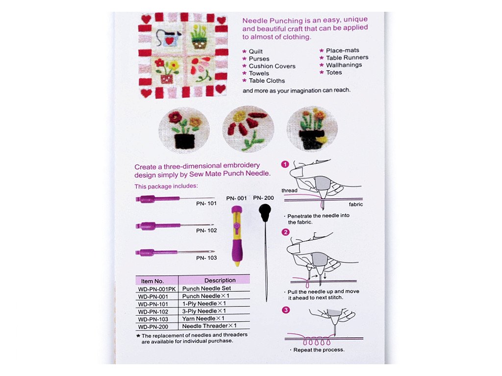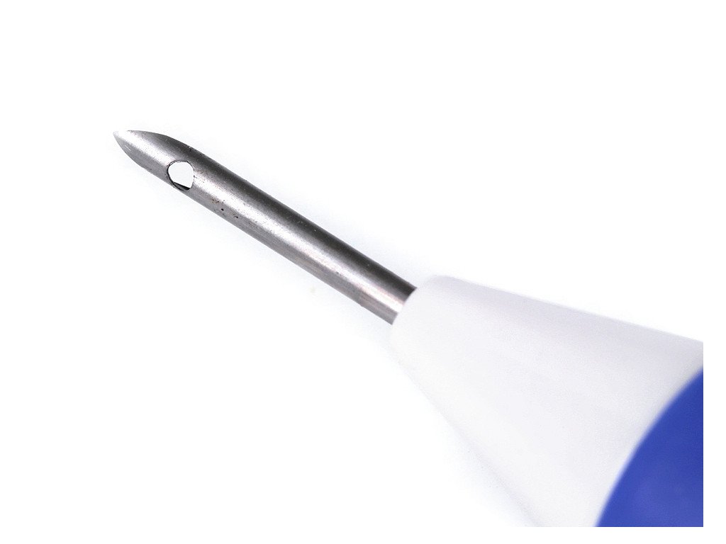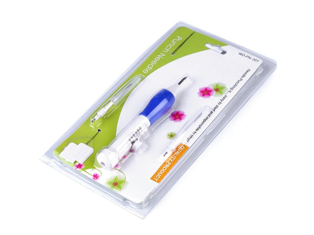 Vyšívanie s dutou ihlou je jednoduché a rýchle. Ihla sa do látky iba vpichuje, neprevlieka sa cez. Pri vyšívaní by mala byť kolmo k látke. Bavlnka, ktorou budete vyšívať, sa navlečie pomocou dlhého navliekača. Vyšíva sa tak, že látku prepichnete a ihlu povytiahnete späť tesne nad látkou, hrot posuniete kúsok v smere vyšívania a opakujete. Snažte sa za priadzu veľmi neťahať, inak sa stehy budú párať. Kým sa celý motív zozadu nepodlepí napríklad vlizelínom, môže sa celý naraz vypárať, nie je zozadu nijako zafixovaný. Táto technika sa hodí na obrázky, ktoré sa zozadu podlepia a poprípade dajú pod sklo do rámčeka. Ak chcete vyšívať napríklad oblečenie, je lepšia klasická ihla. Podrobný obrázkový návod nájdete vo vnútri balenia. Súprava obsahuje: dutú ihlu s Ø2 mm, 2 ihly s Ø1,6 a 1,3 mm, 2 dlhé navliekače. Na novom obale môžu byť chybne nafotené pružinky, ktoré nie sú súčasťou balenia.