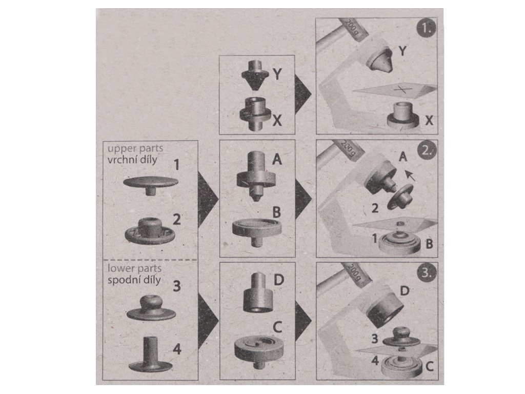 Stláčacie gombíky s označením "wuk" sú určené na spájanie stredne hrubých látok s hrúbkou 0,5 - 1,5 mm . Nitovanie sa vykonáva plastovým mini lisom, ktorý je súčasťou balenia. Gombíky nehrdzavejú .