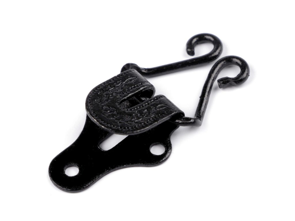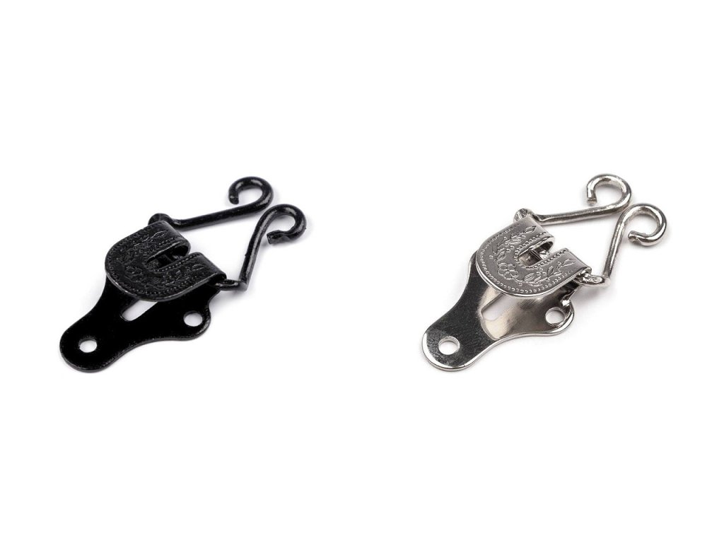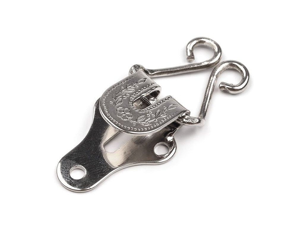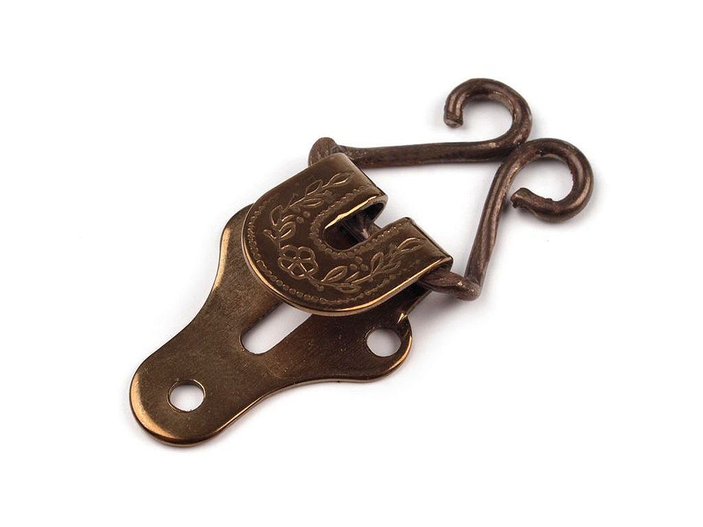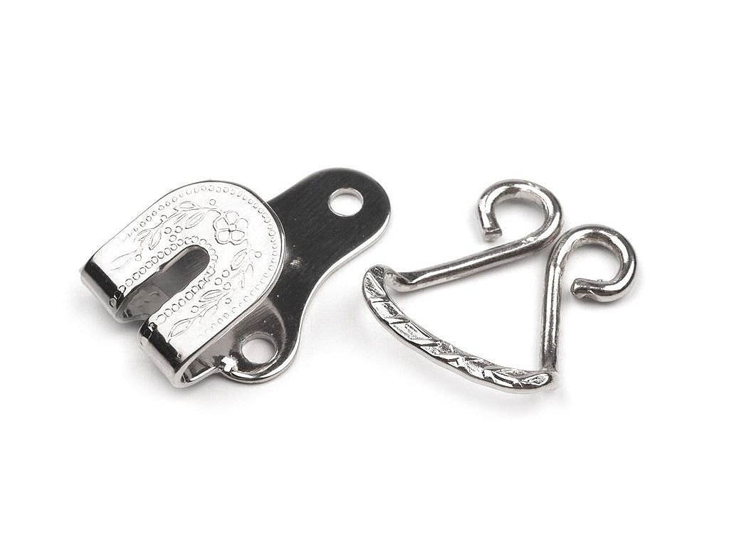 Kovový háčik je ozdobený rytým vzorom. Skladá sa z dvoch častí - háčika a protikusu s očkami. Háčik sa používa ako zapínanie u odevných výrobkov, napríklad pánskych a dámskych nohavíc alebo sukní. Môžete ho použiť i na tričká, vesty či mikiny.