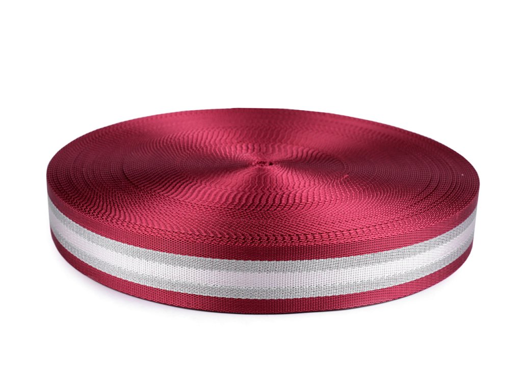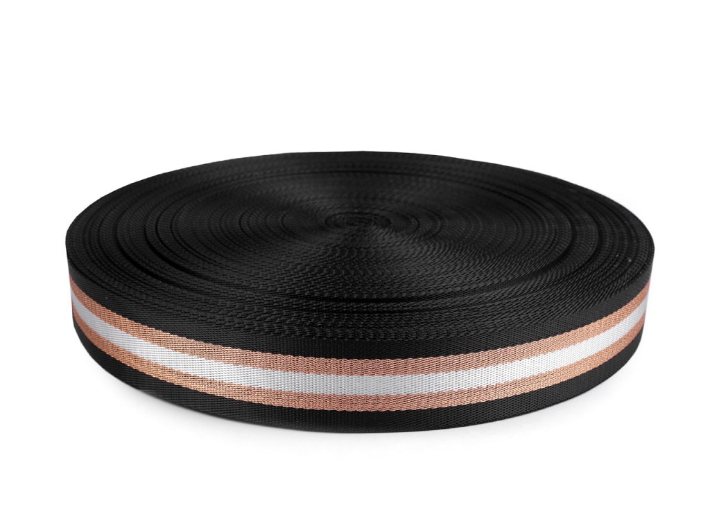 Pevný hladký popruh vyniká lurexovými pruhmi , ktoré sa pútavo trblietajú. Je obojstranný. Vyžijete ho na výrobu tašiek, kabeliek, batohov, lemovanie textilných výrobkov, ako aj výplet čalúneného nábytku a pod.
