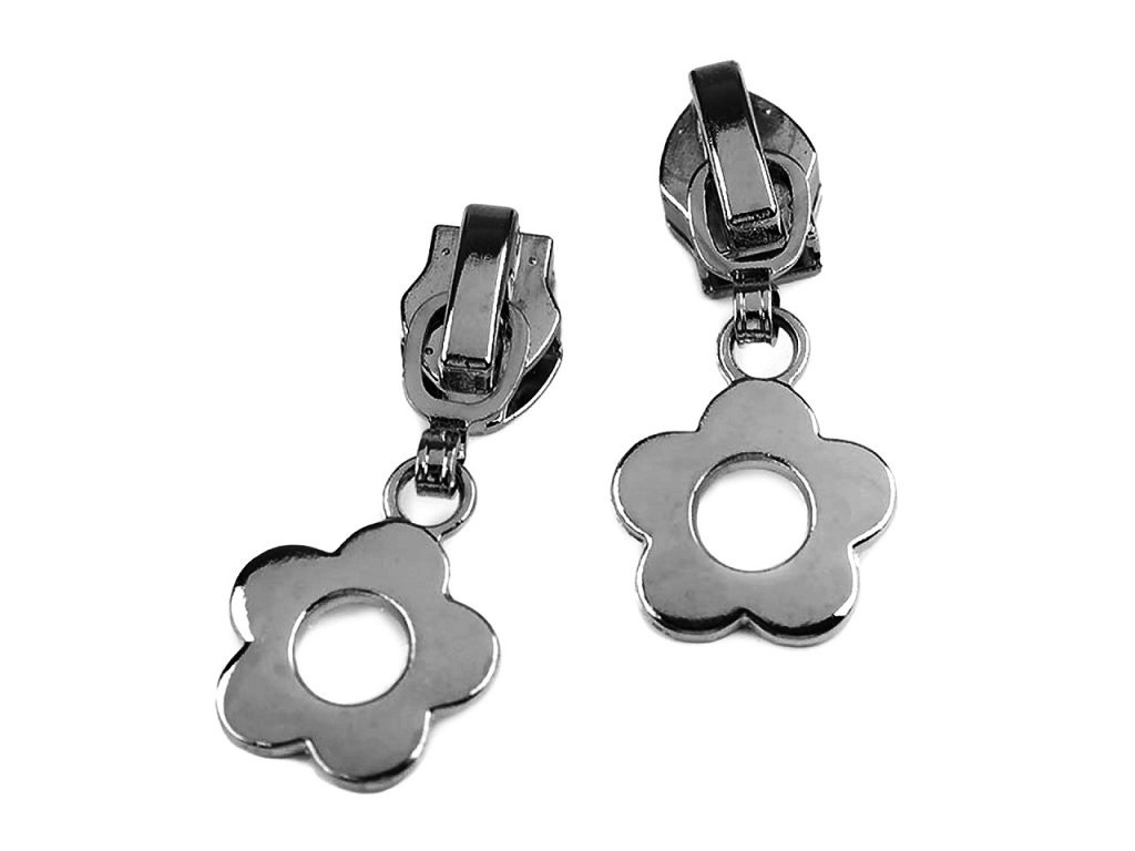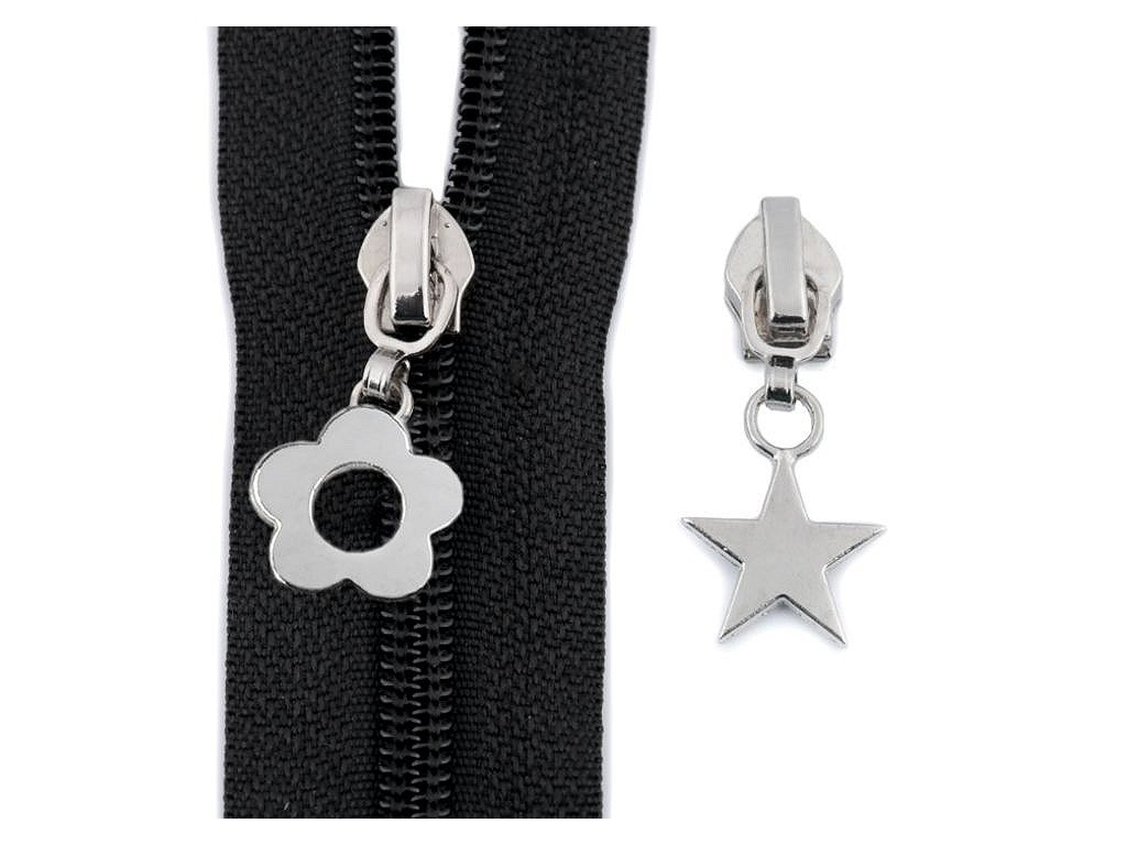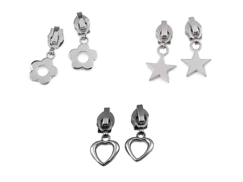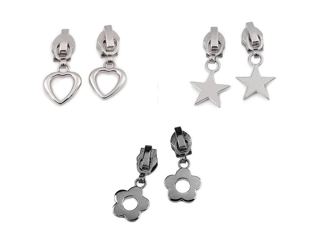Kovový jezdec má táhlo s designem srdíčka, hvězdy nebo květu. Je určený ke spirálovým zipům, které najdete pod kódem 800963, 790304, 750503. Můžete ho využít nejen na oděvy, ale také na výrobu tašek a kabelek.