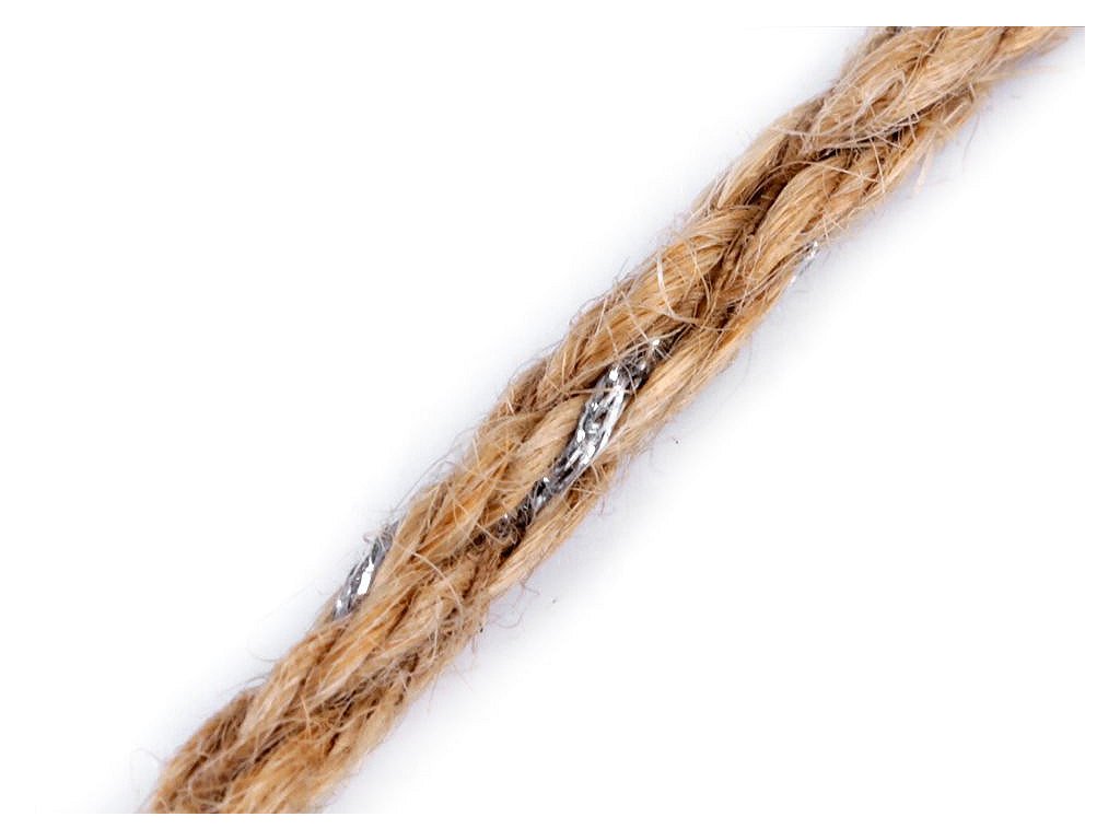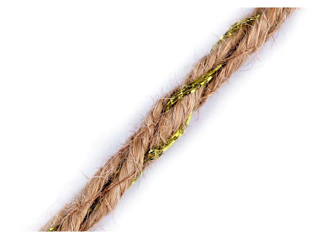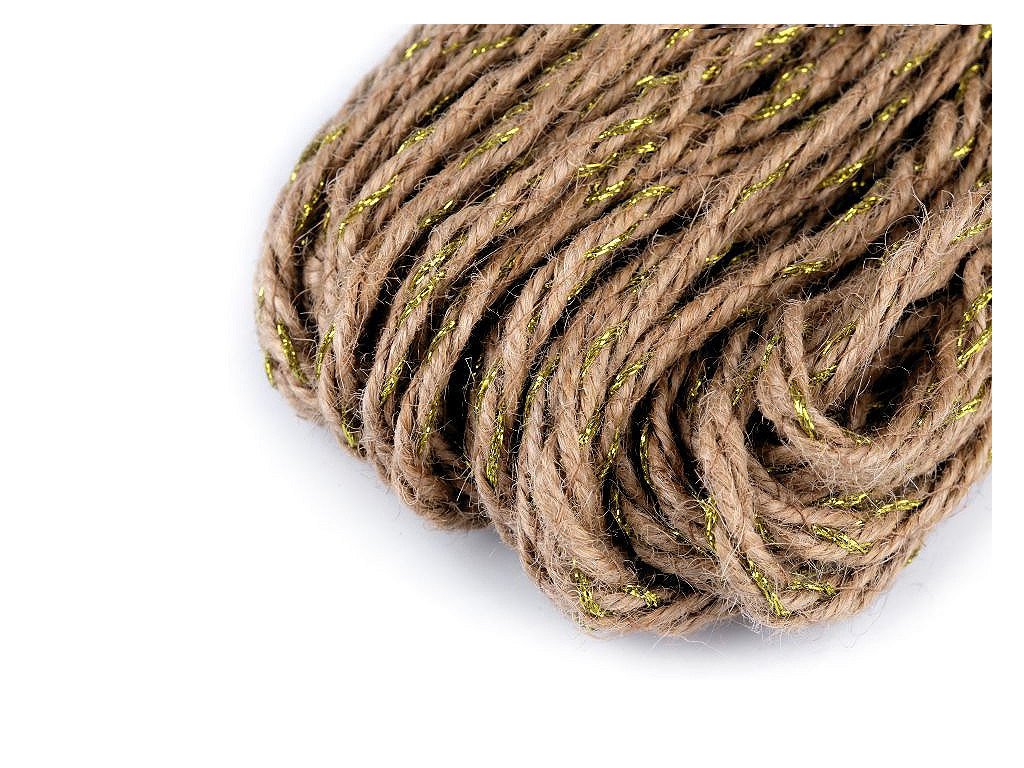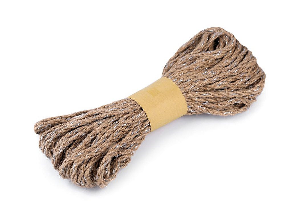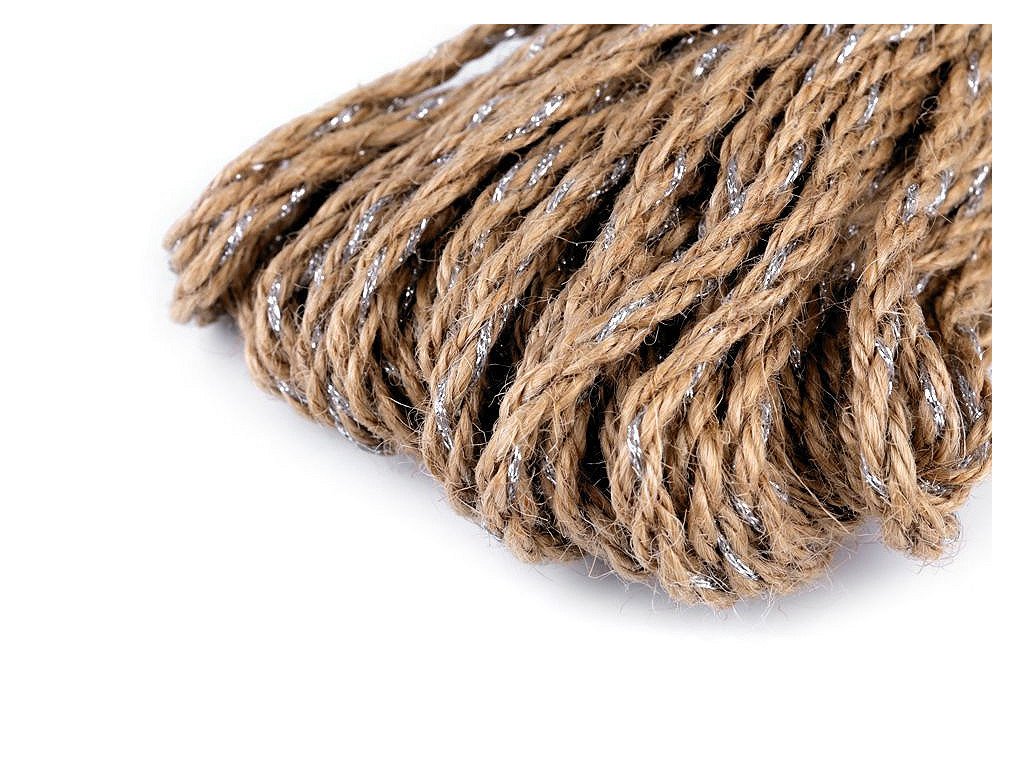 Točená jutová šnúra je pevná, spletená z troch tenších šnúr a pretkaná trblietavým lurexom.