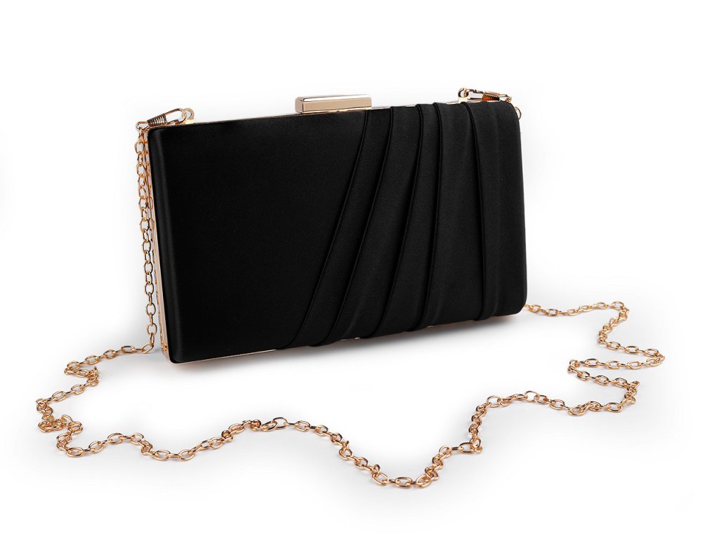 Malá společenská kabelka vyzařuje eleganci a luxus. Její povrch má saténový lesk. Na přední straně je ozdobená zřasenou tkaninou. Kabelka má po celém obvodu kovový rámeček. Je pevně vyztužená, její součástí je dlouhý odnímatelný řetízek na karabiny.