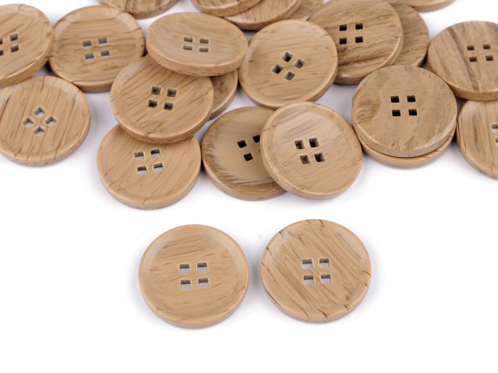 Čtyřdírkové knoflíky mají zesílený okraj a svým zabarvením připomínají strukturu dřeva. Jejich dírky nejsou typicky kulaté, ale mají tvar čtverce. Knoflíky vyniknou na kabátech, svetrech, vestách, sakách apod.