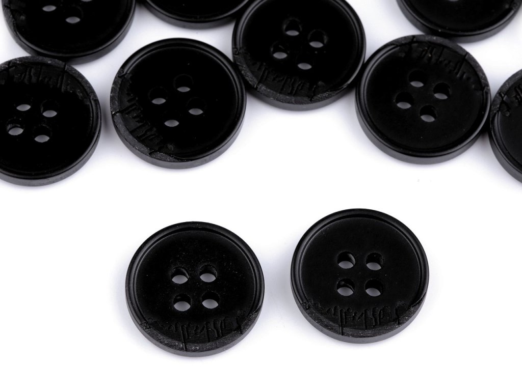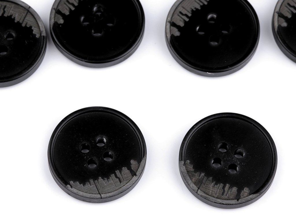 Efektní čtyřdírkové knoflíky vyniknou na košilích, sakách, bundách i svetrech. Část knoflíku je designově šrafovaná.