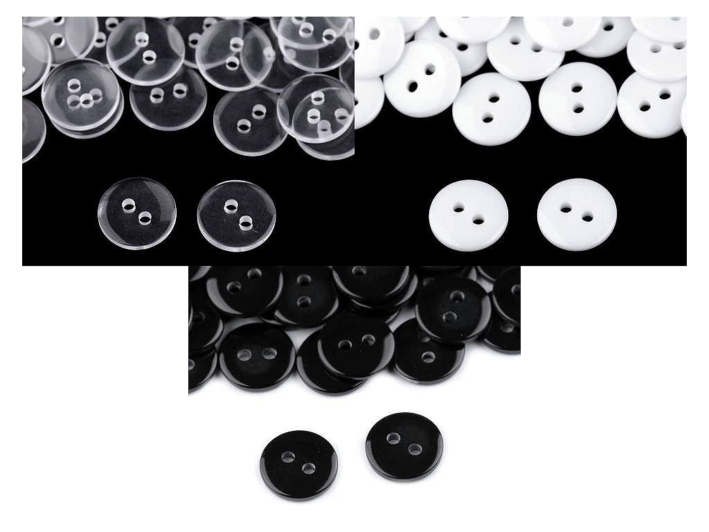 Dvoudírkové knoflíky jsou vhodné k našití na košile, košilové límce, svetříky apod. Jsou hladké, hodí se i na podšití.