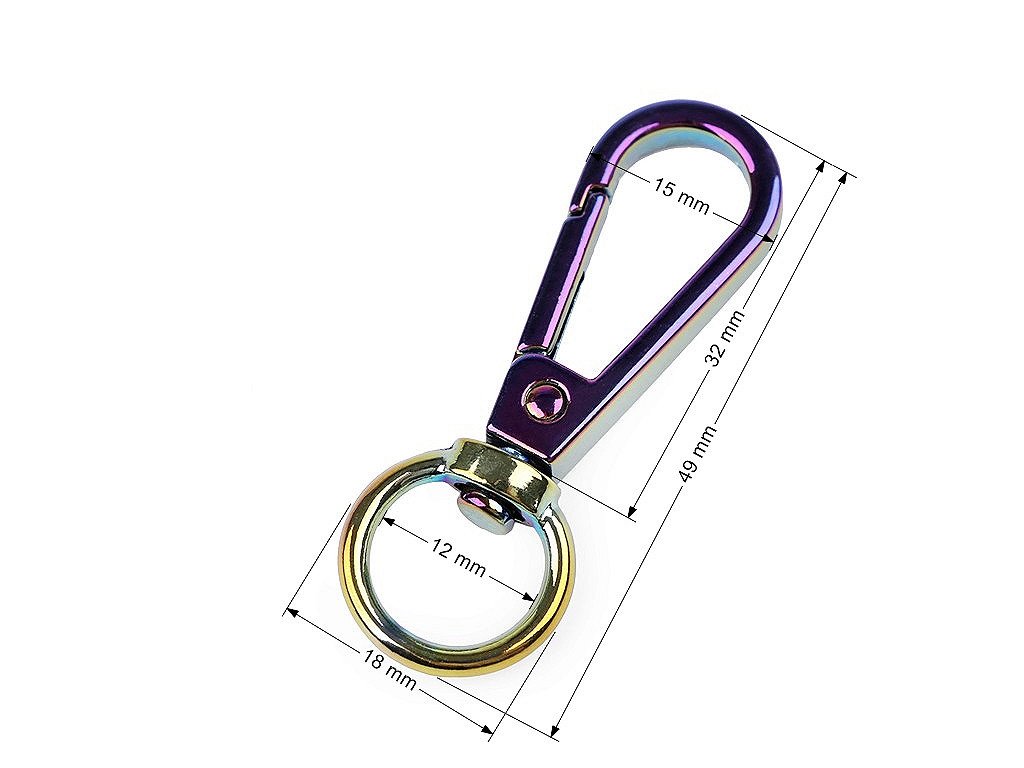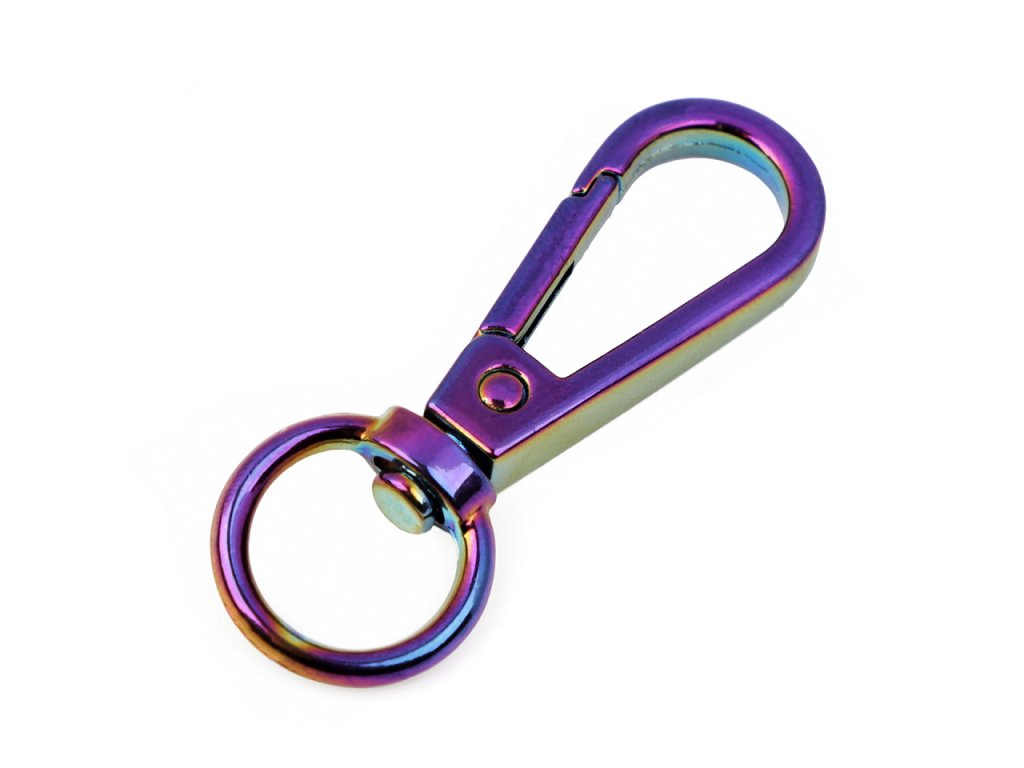 Kovovú karabínu zdobí efektný holografický povrch, ktorý vrhá zaujímavé odtiene. Využijete ju na upevnenie popruhov, remienkov či retiazok na tašky a kabelky alebo na výrobu kľúčeniek. Je otočná.