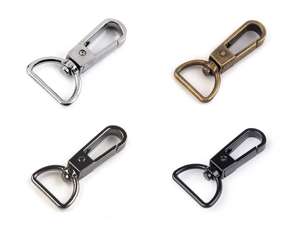 Kovová karabina je otočná. Využijete ju k výrobe klúčeniek, vodítok na psov alebo k pripevneniu popruhov na tašky a kabelky.