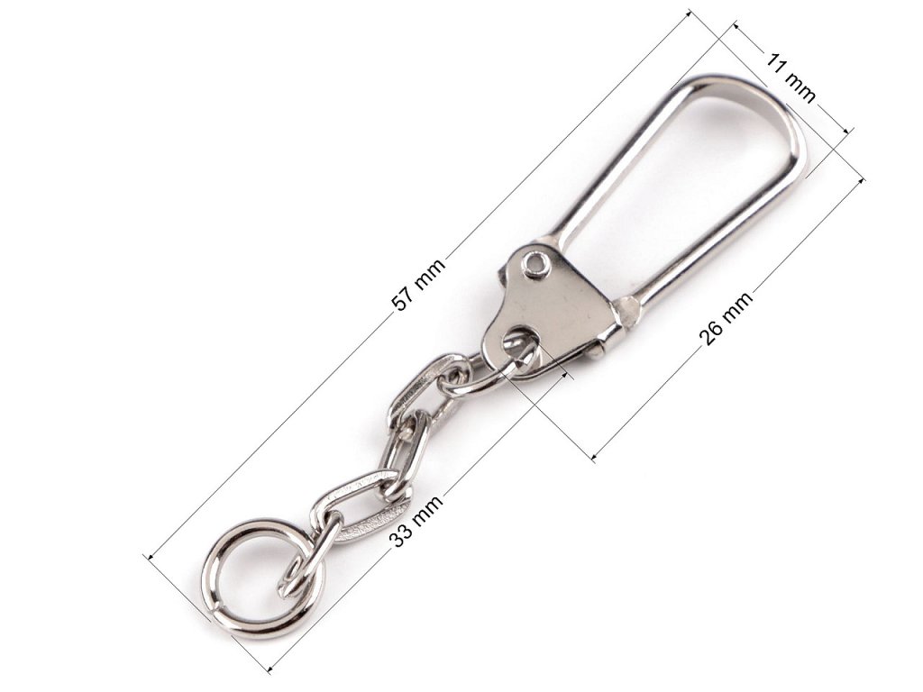 Materiál: kov, Rozměry celkem:: 11 x 57 mm, Rozměry karabinky:: 11 x 26 mm, Hmotnost:: 1,5 g