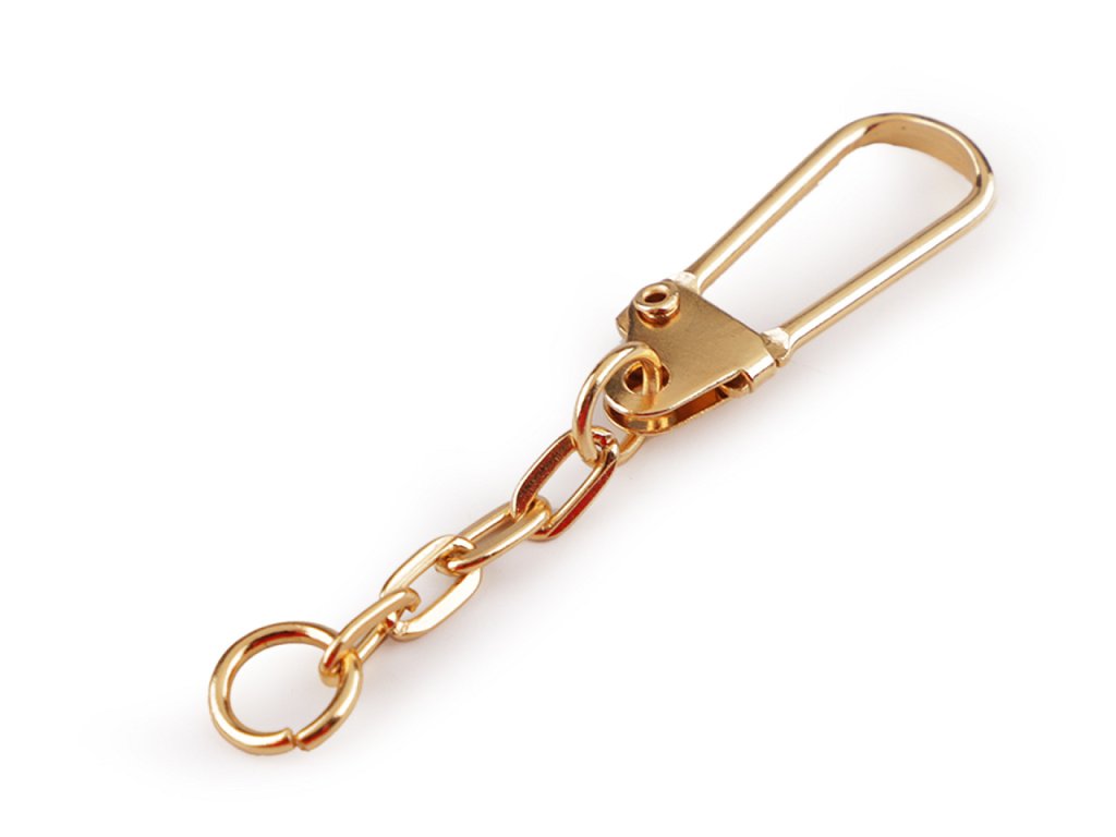 Menšiu kovovú karabínku s retiazkou využijete na výrobu kľúčeniek a pripevnenie retiazok na malé kabelky či listové kabelky. Je vhodná aj na pripevnenie príveskov k taškám, kabelkám a batohom. Dĺžka retiazky je 33 mm.