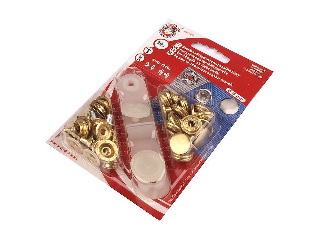 Stláčacie gombíky sú určené na spájanie silných látok. Nitovanie sa prevádza plastovým mini lisom, ktorý je súčasťou balenia. Gombíky nehrdzavejú. Vhodné na hrúbku materiálu 1 - 3 mm.