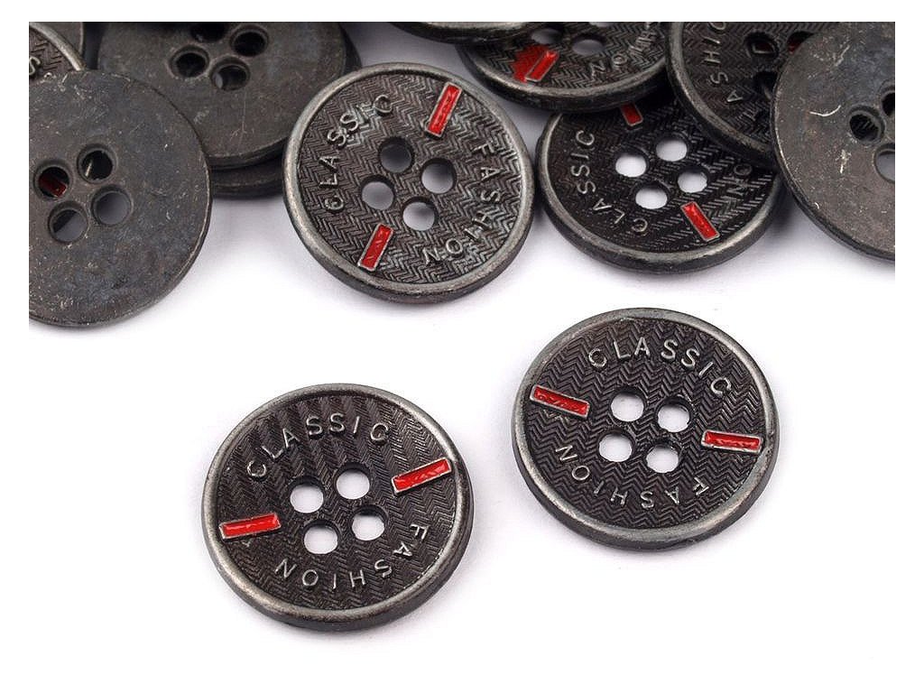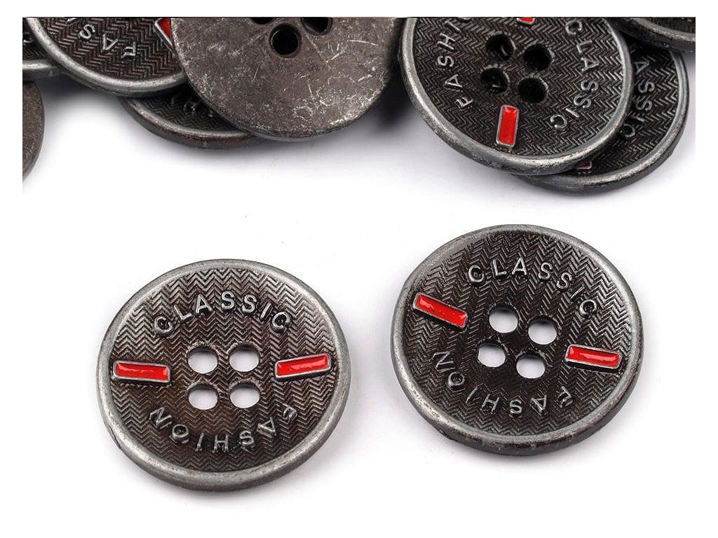 Knoflíky jsou vyrobené z nemagnetického kovu. Zdobí je nápisy "classic" a "fashion". Jsou čtyřdírkové. Knoflíky můžete našít na košile, mikiny, bundy apod.