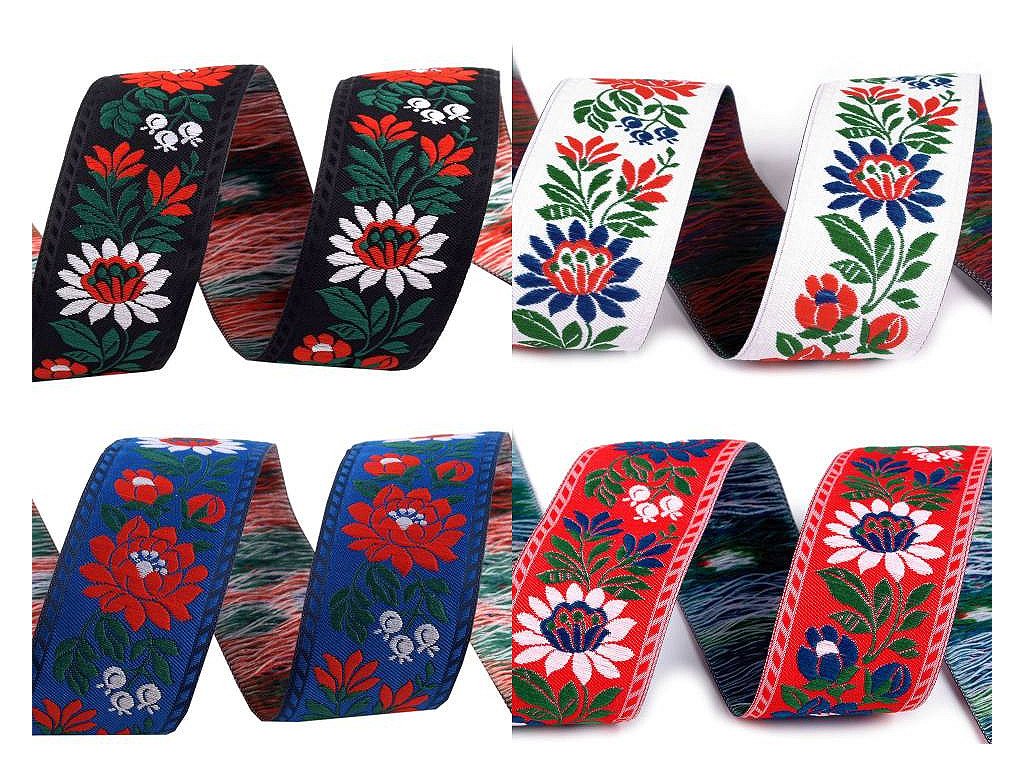 Krojovou vzorovku můžete použít nejen ke zdobení krojů, ale i běžných oděvů, prádla, bytových textilií, hraček a upomínkových předmětů. Použití je variabilní. Stuhy vyniknou svou barevností na látce různého dezénu a barvy. Jsou tkány na jehlových stavech a vyrábějí se již jen v materiálu polyester! Šíře stuhy je 35 mm. Dodáváme v návinu po 25 m.