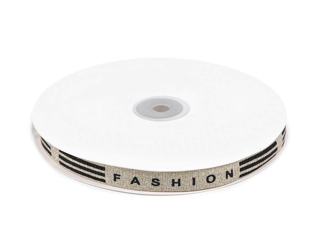 Lurexový lampas s nápisom Fashion štýlovo dozdobí vaše odevy. Je jednostranný, veľmi pevný.