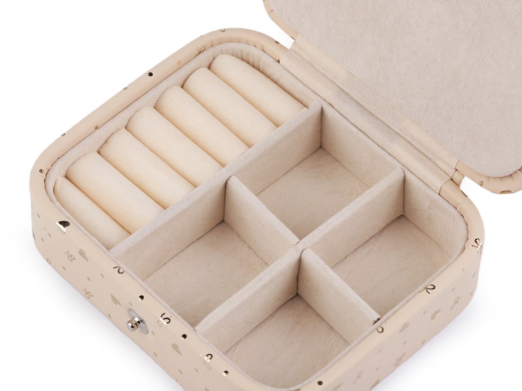 Malá šperkovnice se 2 patry má povrch ozdobený lesklým potiskem srdcí a mašliček. Disponuje velkým množstvím úložného prostoru. Zapínání na patent, spolehlivě sepne obě patra dohromady. Je perfektní na doma i na cestování.