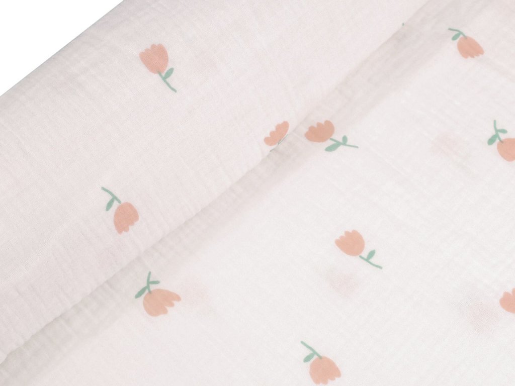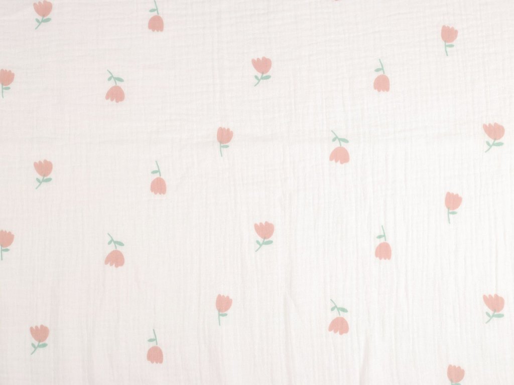 Mušelín zdobí potisk tulipánů. Je lehký, prodyšný a neprůsvitný, tkaný ze speciálně vyhlazených vláken. Zároveň vyniká dostatečnou pevností. Pokožka si ho zamiluje hlavně v letních měsících. Velkou výhodou je, že se nemusí žehlit.