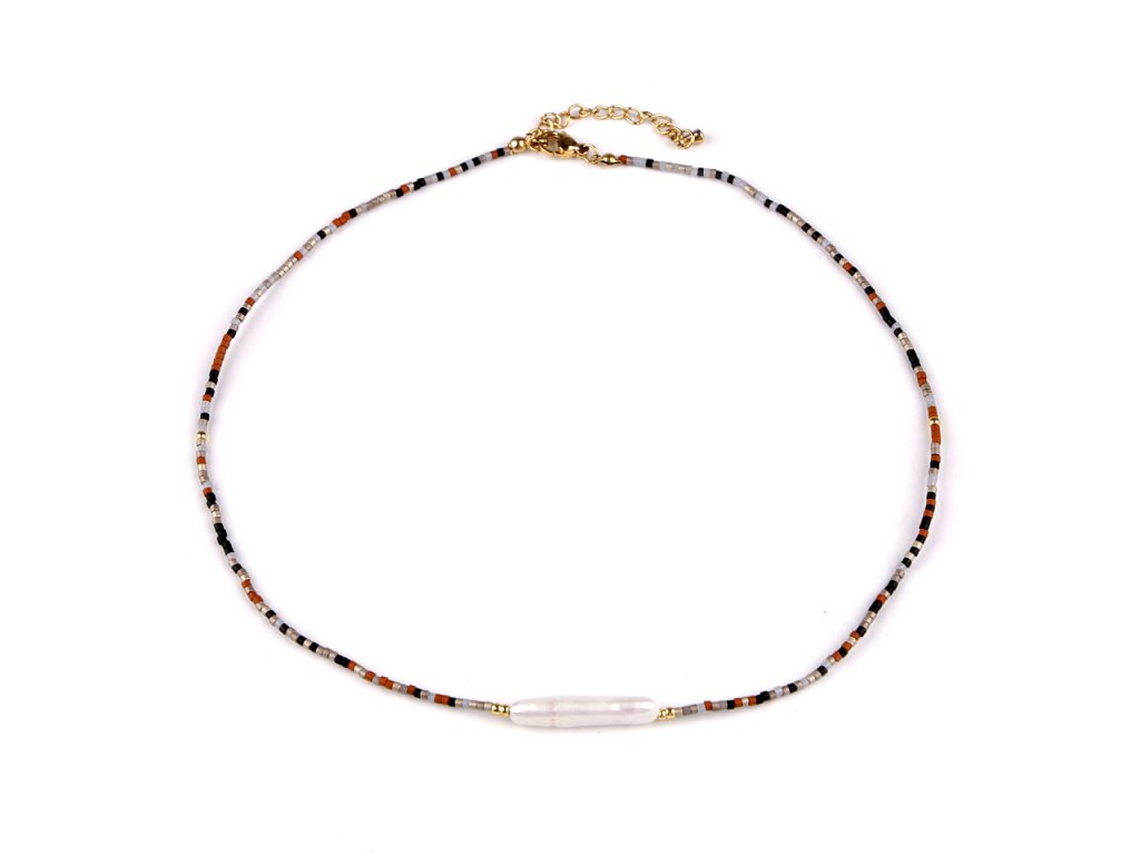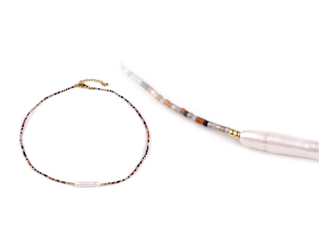 Elegantní náhrdelník je ručně vyrobený z jemných korálků japonského rokajlu, který je známý svou precizností a kvalitou. Uprostřed je ozdobený nádhernou podlouhlou říční perlou. Hodí se ke slavnostním příležitostem i na běžné nošení, skvěle podtrhne i business styl oblékání. Dokáže zjemnit a doladit jakýkoliv outfit, od formálního oblečení po neformální. Náhrdelník potěší každou ženu, je dárkem, se kterým nešlápnete vedle.
